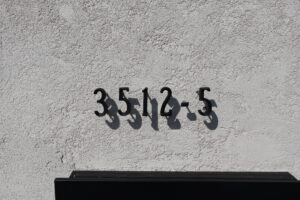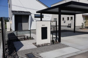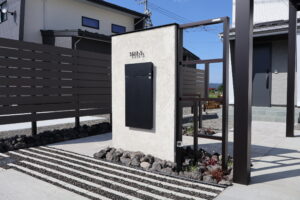 門柱は宅配ボックスと笠木を木調にして高級感を出しています。同じく道路沿いのフレームフェンスも笠木を木調にしています。玄関の柱が木材なのでつながりが出来るように工夫しています。