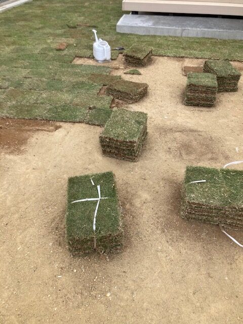 施工担当の芝貼り作業のお手伝いをさせていただきました。今回は、お客様の庭の天然芝の芝貼りを2軒行いました。
