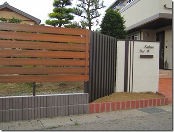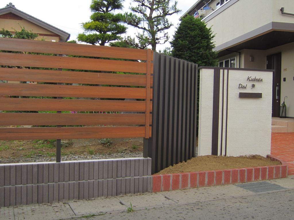 エクステリア工事をした現場の門柱の横の道路側にアルファウッドで目隠しをしました。 門柱の高さは1m50㎝ほどで、マイティウッドの塀にできた隙間をアルミ角ポールでふさぎ、その横から化粧ブロックを2段積みその上にマイティウッドを7段張りして施工しました。 ブロックの上に施工するときには、アルミの柱を4㎝角にして立て樹脂板は上から等間隔に隙間を空けて張っていきます、ブロック天端とマイティウッドの一番下の段との隙間は防犯の為にも多少広く有れることが多いです。 長野市内の施工現場