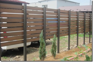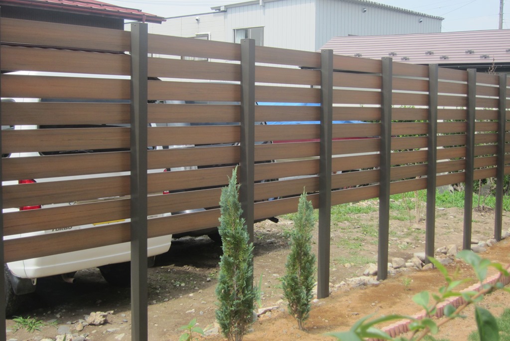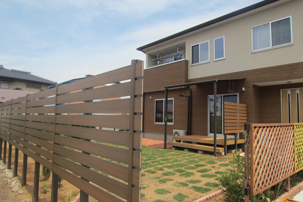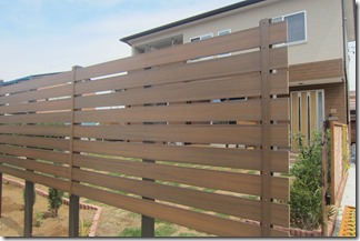 庭の南側にマイティウッドを施工して目隠し工事をしました、エクステリア工事で最近人気の樹脂板の塀工事は、従来の木製の塀に比べメンテナンスが簡単な上に耐久性にもすぐれているので喜ばれます。生垣などで目隠しをする方もいるのですが管理が大変な事と植木が成長していくと完全に見えなくなく防犯上問題があるので目線の高さは隠れるように施工して足の部分は見えるように施工する事が多いです。 マイティウッドで人気のチークプラウンで施工しています。