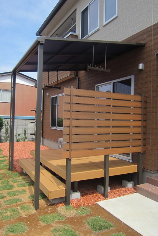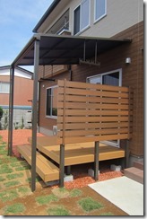 庭の南側だけではなく、リビングの前に作った木樹脂デッキ・アルミテラスの側面にも、マイティウッドを施工して見えなくしプライベト空間になるようにしています。  長野市内の目隠し現場