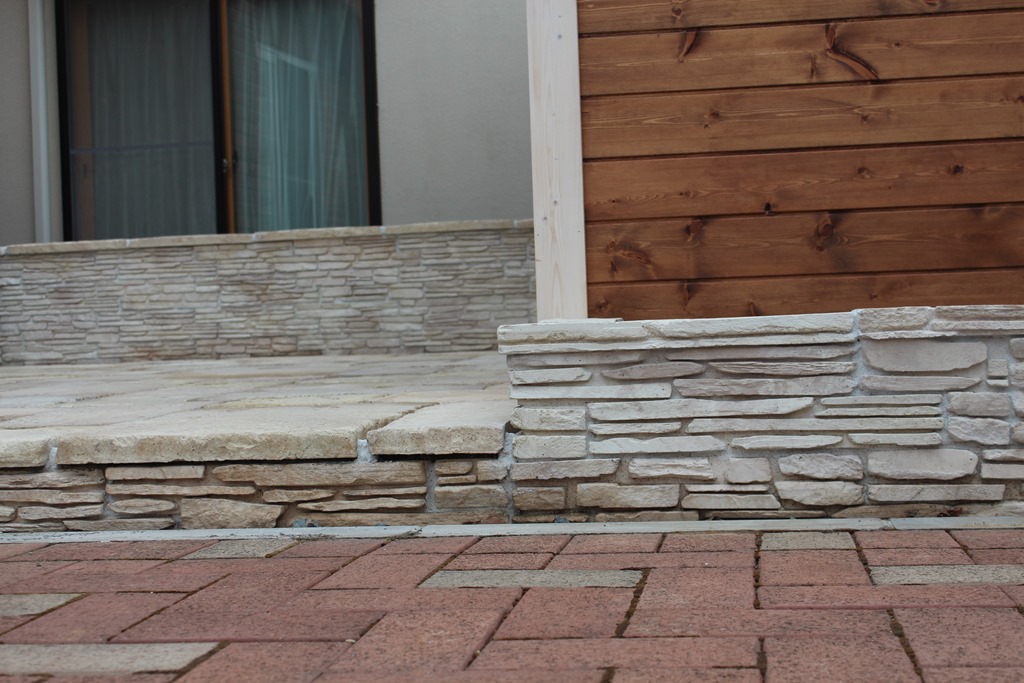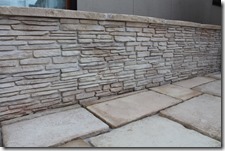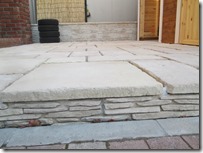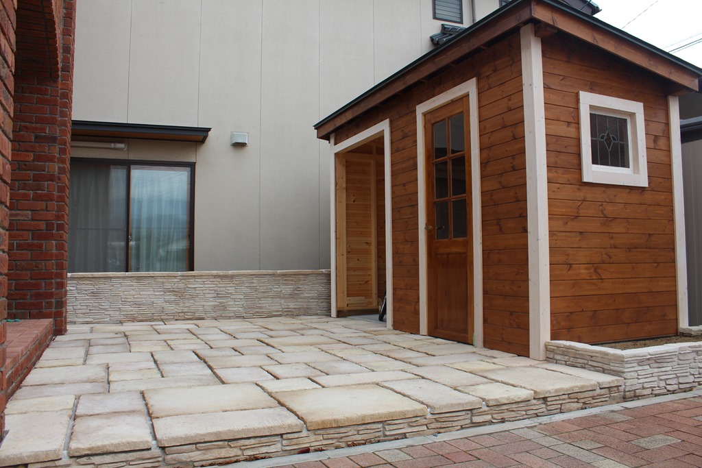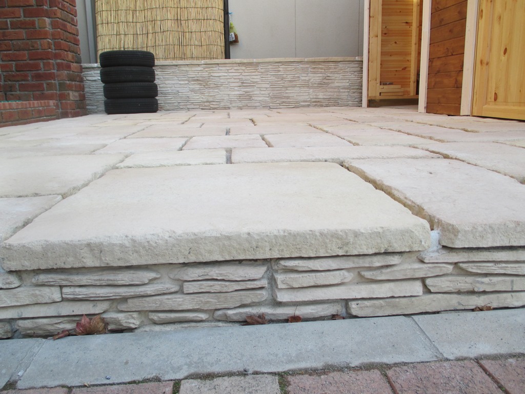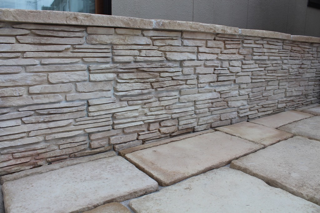物置とリビングの間の空間は、芝生を剥ぎ取り、駐車場よりも一段高く設定しました、立ち上げり部分は英国製のブラッドストーンマドックZのジロンデで施工しています、マドックはイギリスのコッツウェル地方でよく見られる石を重ねるようにして積んだイメージの擬石でとてもよくできています。物置の側面はマドックを一段高く積み花壇にして、突き当りの境界はマドックを4段積みにして、上に300×600の敷石を乗せて腰かけることもできるベンチになるような低い塀でこの空間が引き締まるようにしました。