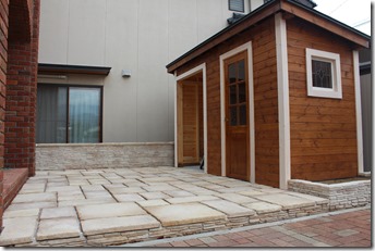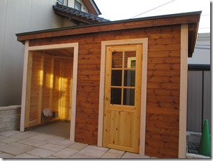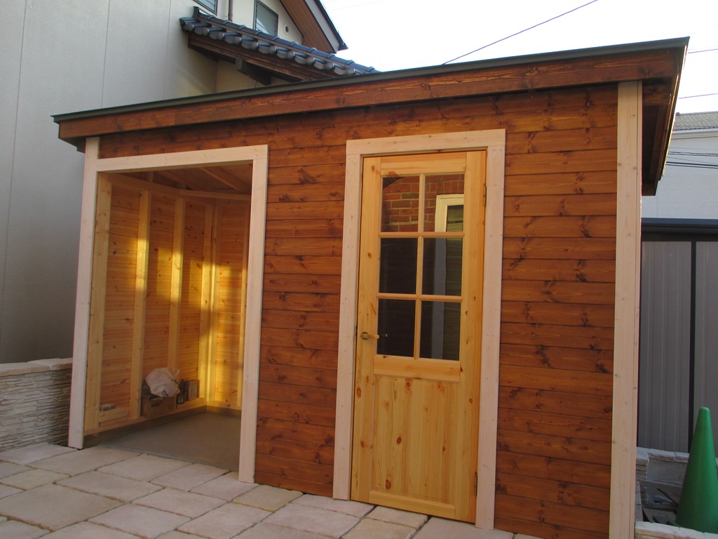 駐車場の後ろにあった庭には前面芝生が貼られていましたか、芝生の手入れが大変事と、物置と自転車置き場も考えていたので。木製のキッドではなく大工さんを入れて屋根は板金屋さんにお願いして手前を物置に、奥側は自転車置き場にしてパイン材で作りました。