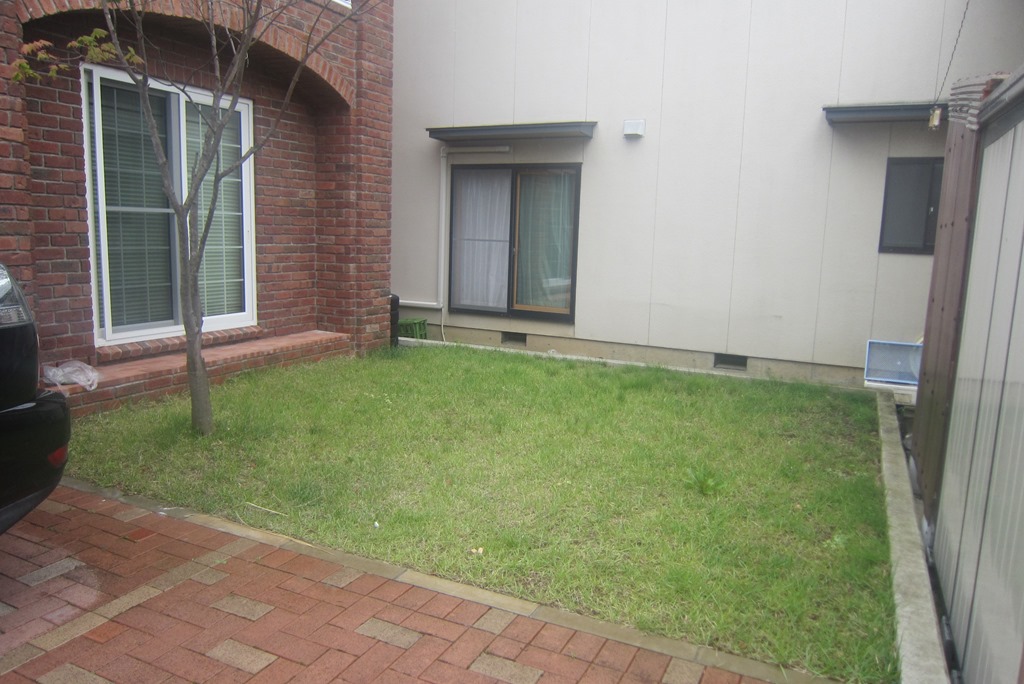 庭のリフォーム前の芝生が貼られた状態です。エクステリア工事で庭を施工するときには芝生を貼る事が多いのですが、手入れが大変で他のものにしたいと言う要望も多いことは事実です。