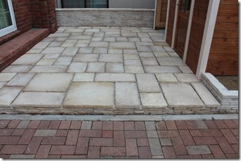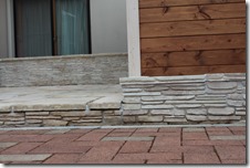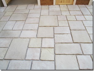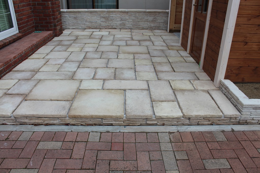 床はブロッドストーンの敷石の6つのサイズを組み合わせて施工しました。色はジロンデですが、1枚1枚をよく見ると色に違いがあるのですがこれも本物の天然石の風合いに近づける漢字で作っているので素敵です敷石の厚みは4㎝あり目地が深いので綺麗です。