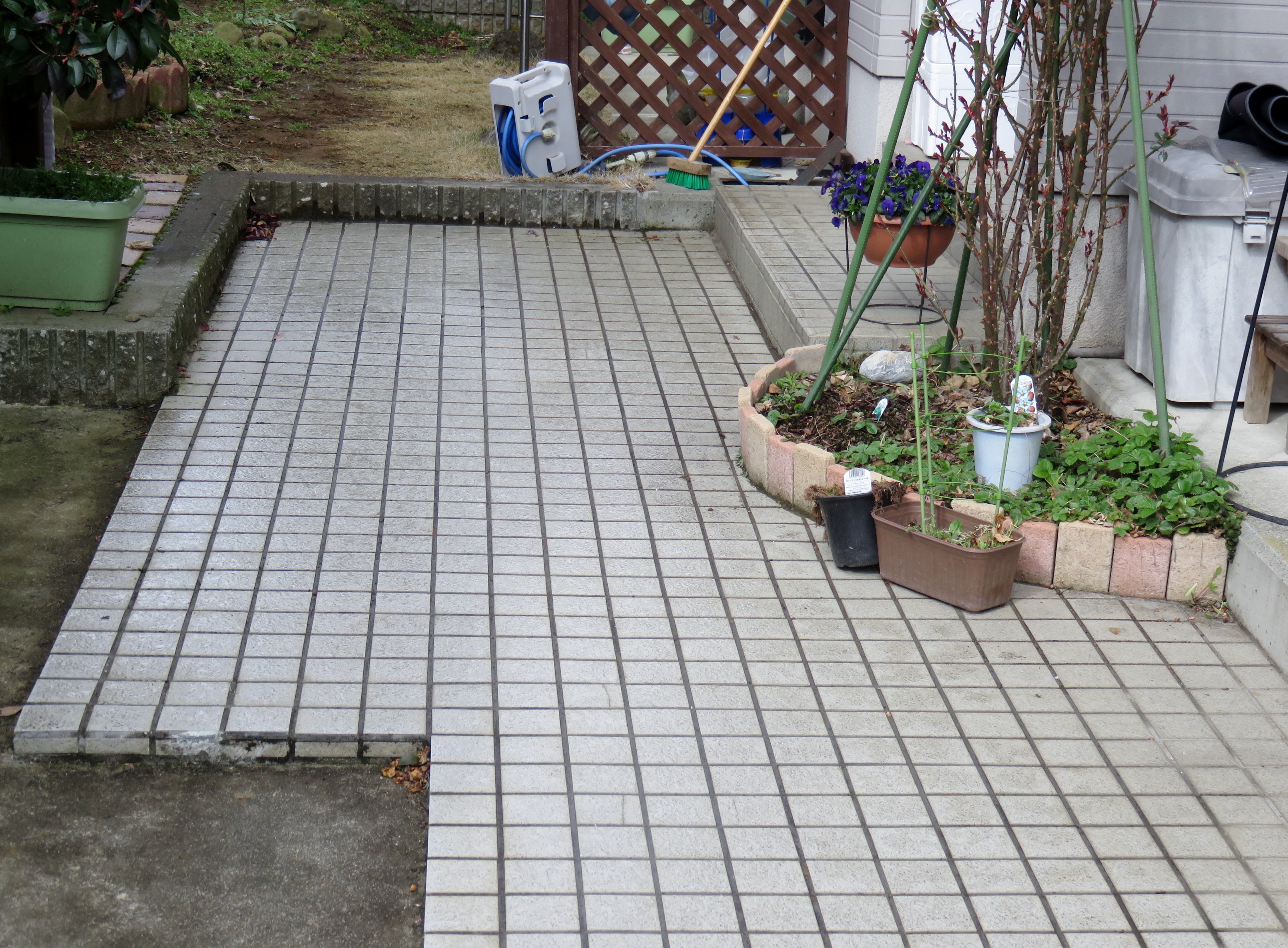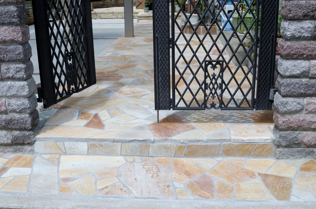 玄関のすぐ横にあった犬走りの中に埋まっていた不凍栓を立ったままの姿勢で使用することのできるスタンドウォッシュリリーに交換しました。 既存の門柱門扉は再利用で残し、タイル貼りだった床を天然石貼りの床に作り変えました。