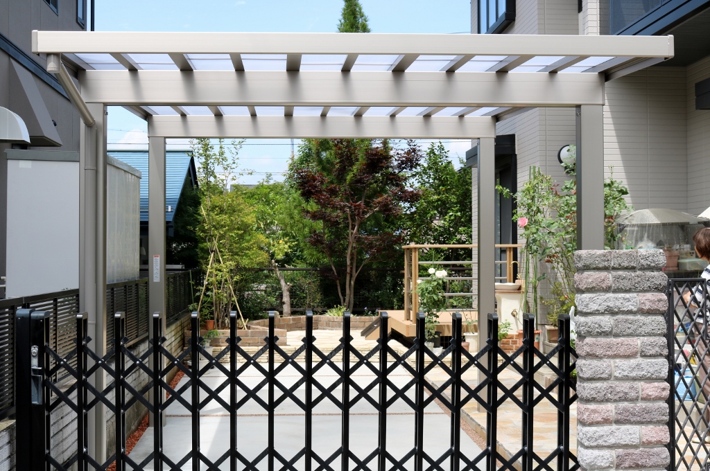駐車場前に取り付けられている伸縮門扉も既存のものを再利用して、新規に積雪50㌢用のカーポートも取り付けました。 既存のアプローチに貼られていたタイルは撤去して天然石に張り替えています。