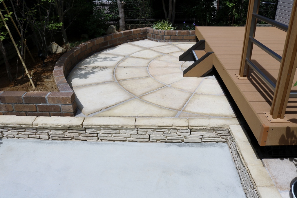 リビングの前に木樹脂デッキを施工して階段を下りるとブラッドストーンのサークルに降りられるようにしました。境界側に植えてある植木を残してレンガを積み土が毀れて来ないように止めててます。履物を履いて降りても、できるだけ汚れない施工のサークルです。