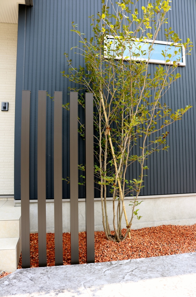 門柱の横にサテンシルバーのH鋼を2本立て、アルミ70角の柱を全部で10本立てています。