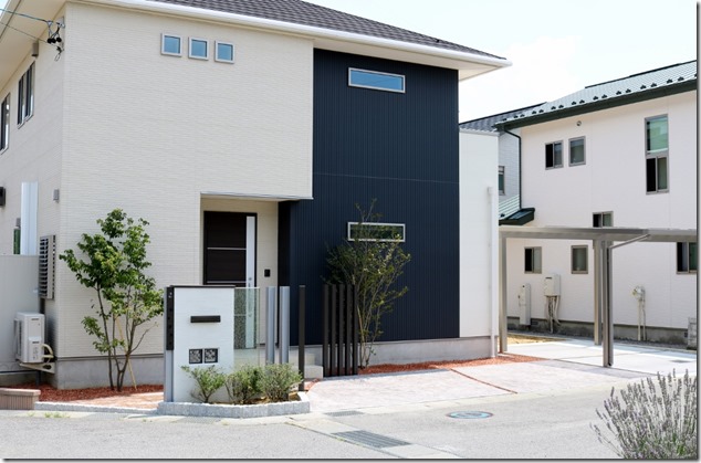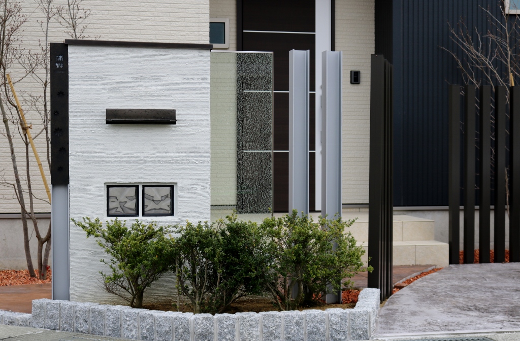 シンプルモダンの建物に合わせ、塗り壁にジュエルグラスとガラスブロックを入れたシンプルな門柱を作りました。門柱の左側に立てたH鋼に、特殊塗装の伊尚表札を取り付けました。右側には、シルバーのH鋼を2本立てています。 塗り壁に埋め込まれたガラスブロックはメタリックで、通常のガラスブロックより光を反射させ綺麗です。