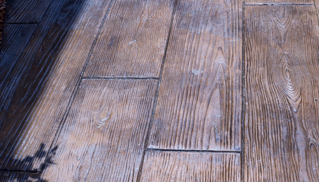 スタンプコンクリートには4パターンの型があります。この現場ではそのうちの2種類のスタンプで施工しました。門柱の後ろ側から玄関までの間は木目調、駐車場の床のコンクリート部分は岩肌を表現したシームレスを施工しています。