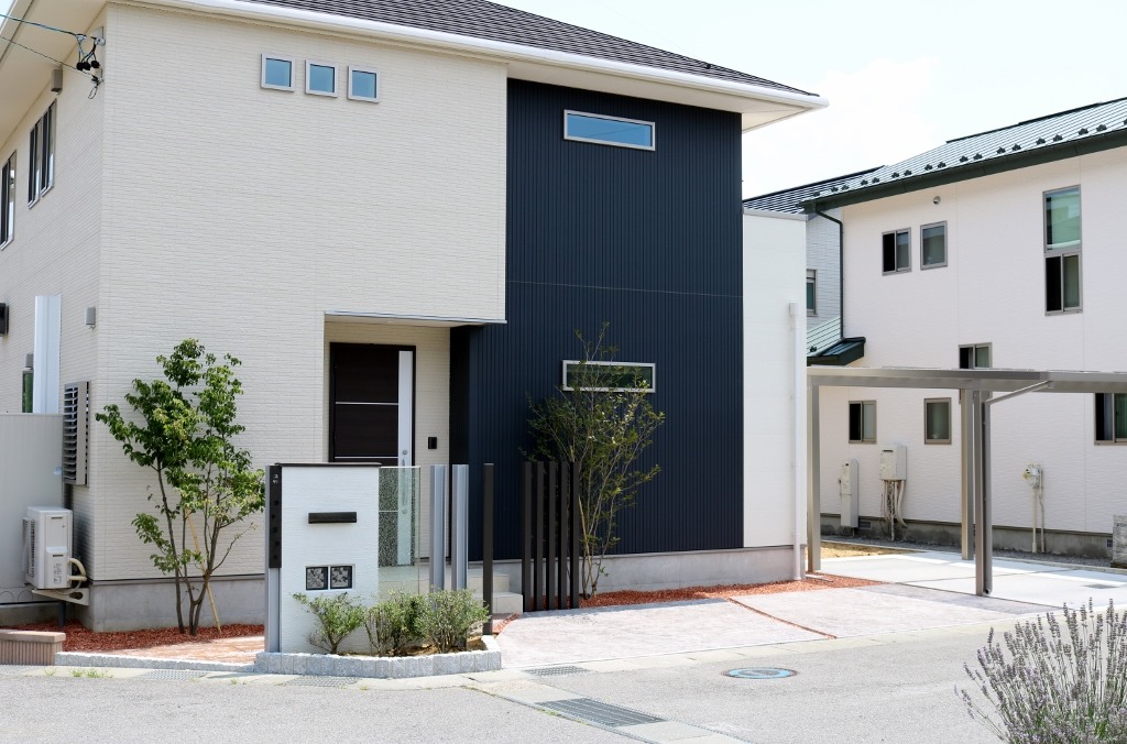 駐車場には、積雪用のカーポート「ソルディーポート」を設置しました。北側の道路と敷地に高低差があったので、化粧ブロックで土留めをし、その上に樹脂板フェンス「アルファウッド」のアイボリーを取り付けました。