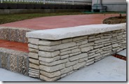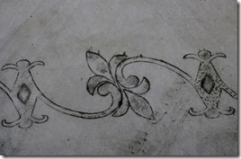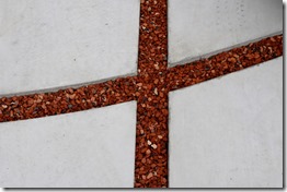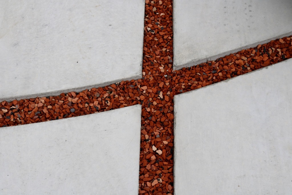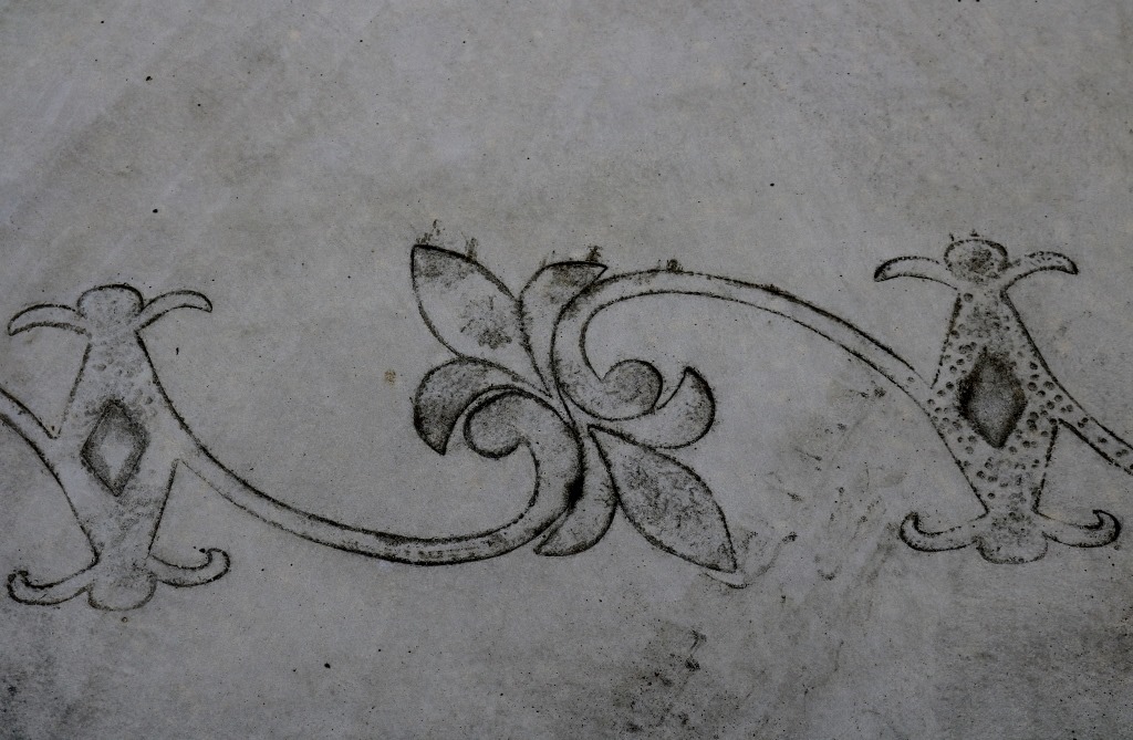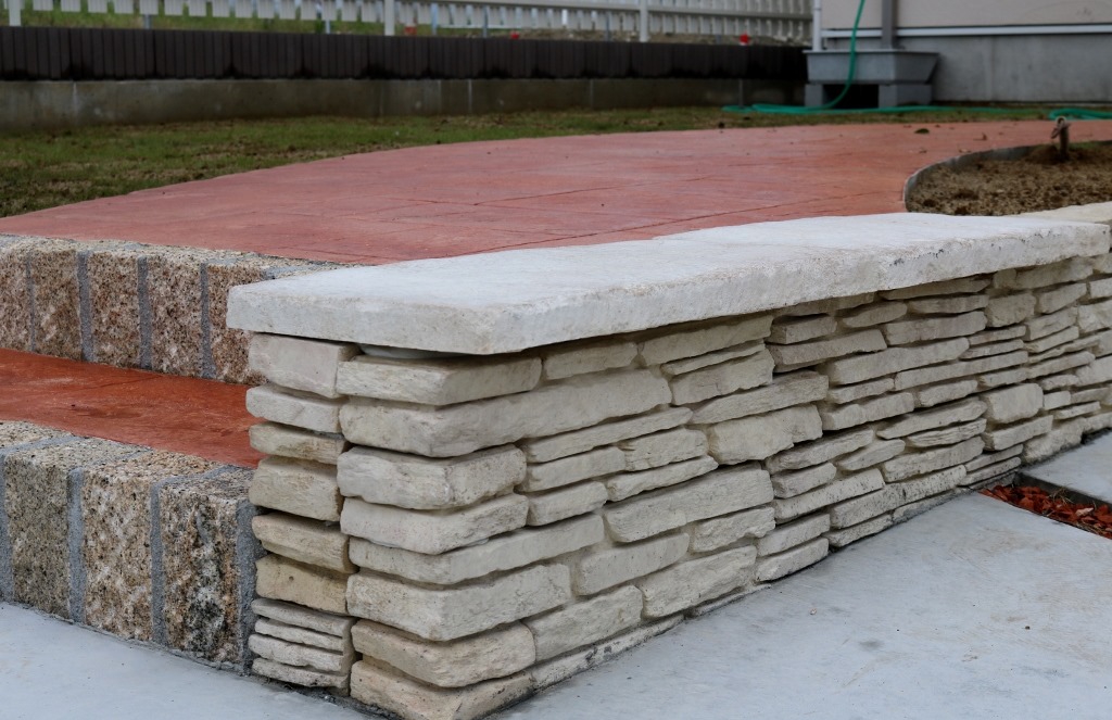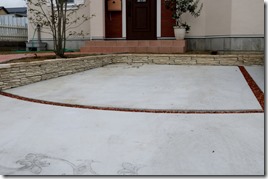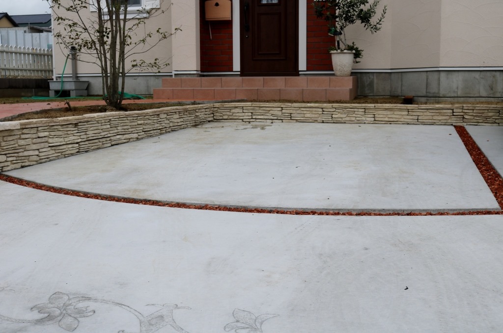 2台分の駐車スペースの敷地との段差のある堺はブラッドストーン・マドックZを積み、道路側にボーダーアートでフルールドリスの模様を形押し、コンクリートの床の目地の中にテコラ(破砕瓦)を入れて、綺麗に見えるようにしました。