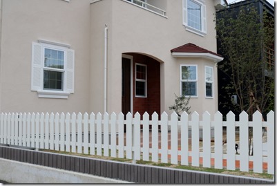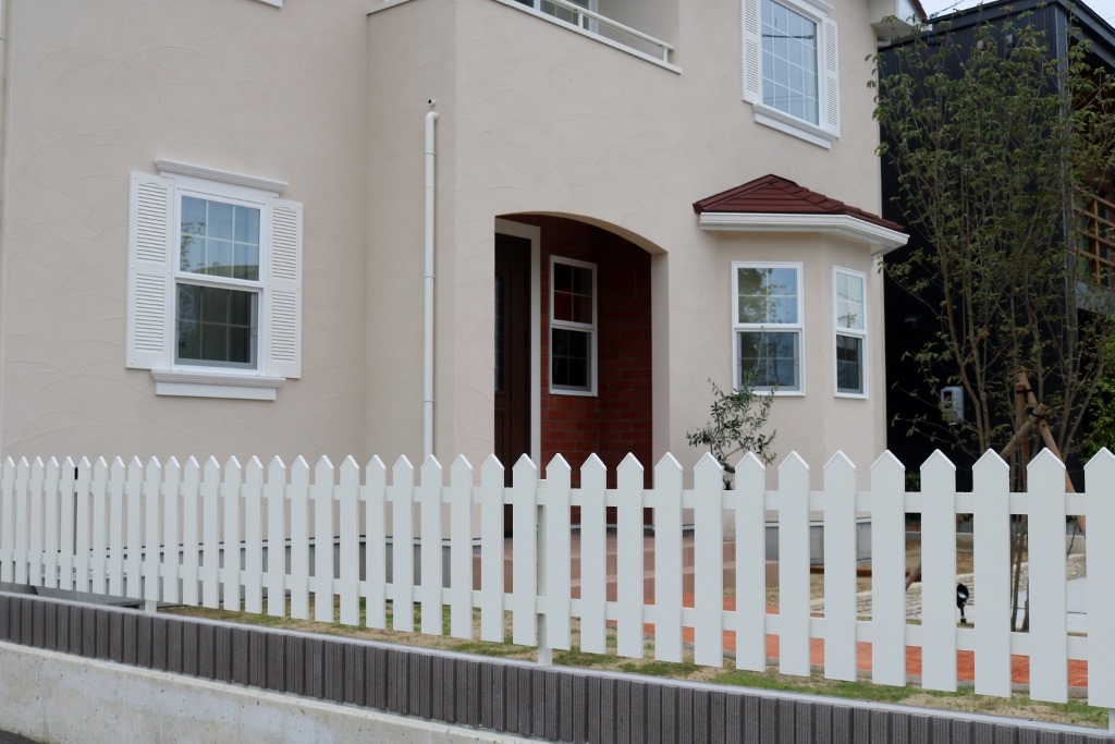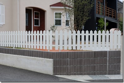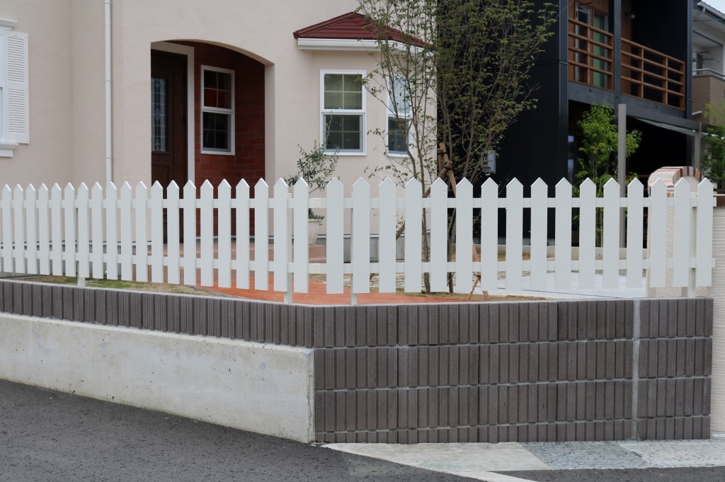 門柱から続く西側の境界線を化粧ブロックをを積み、その上に白いアメリカンフェンスを施工しています。可愛らしい建物に白いアメリカンフェンスがとても似合います。