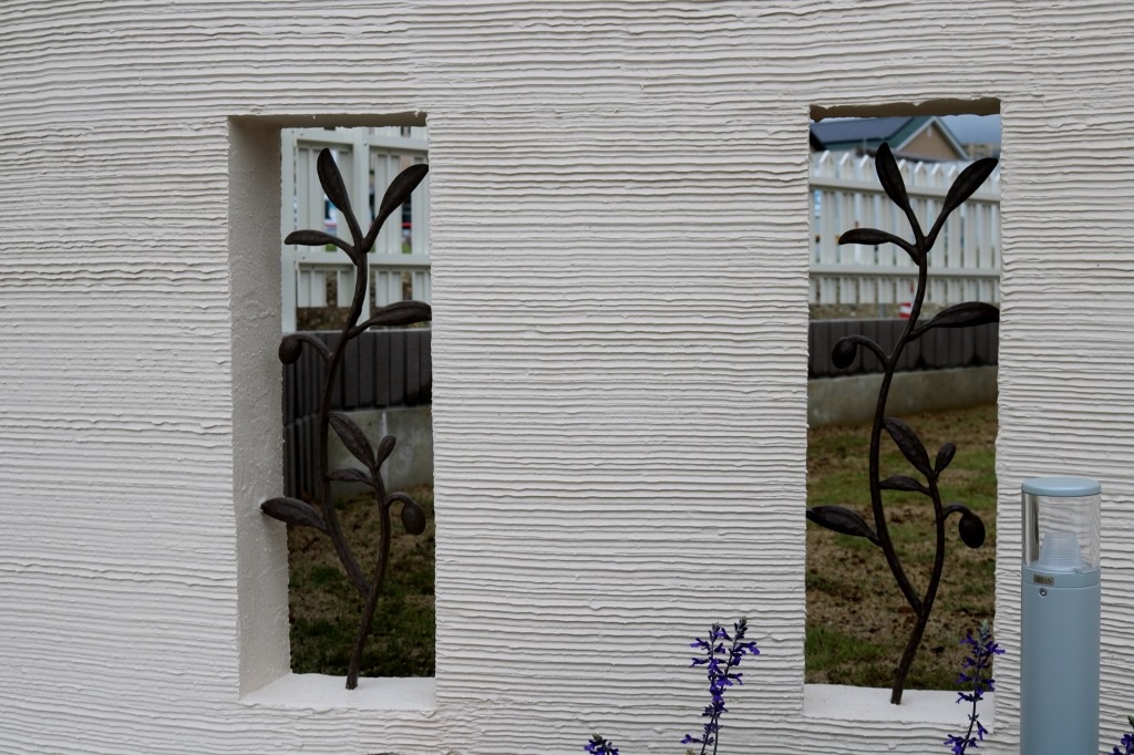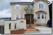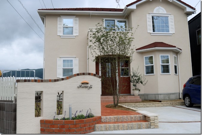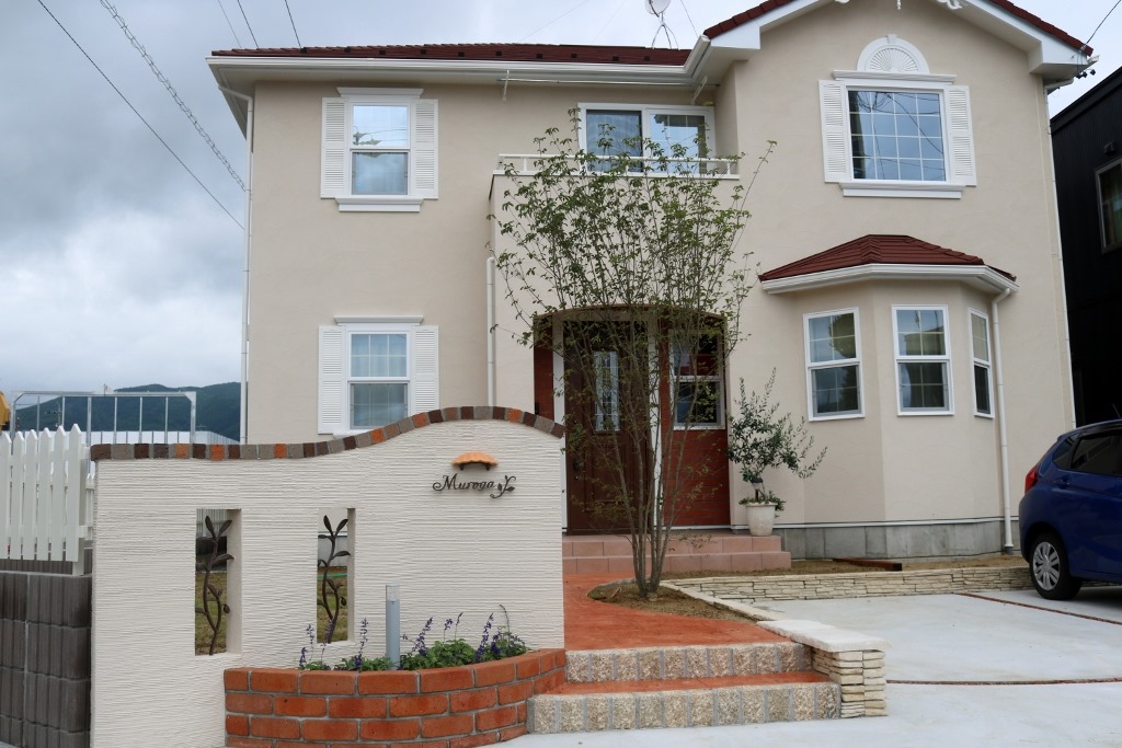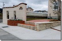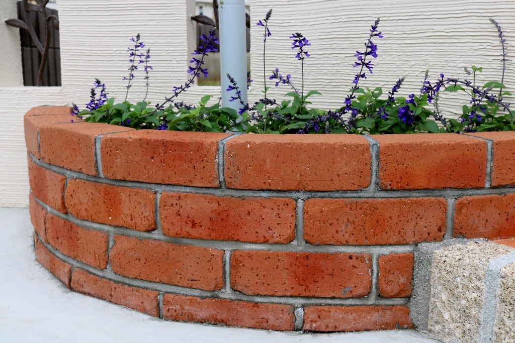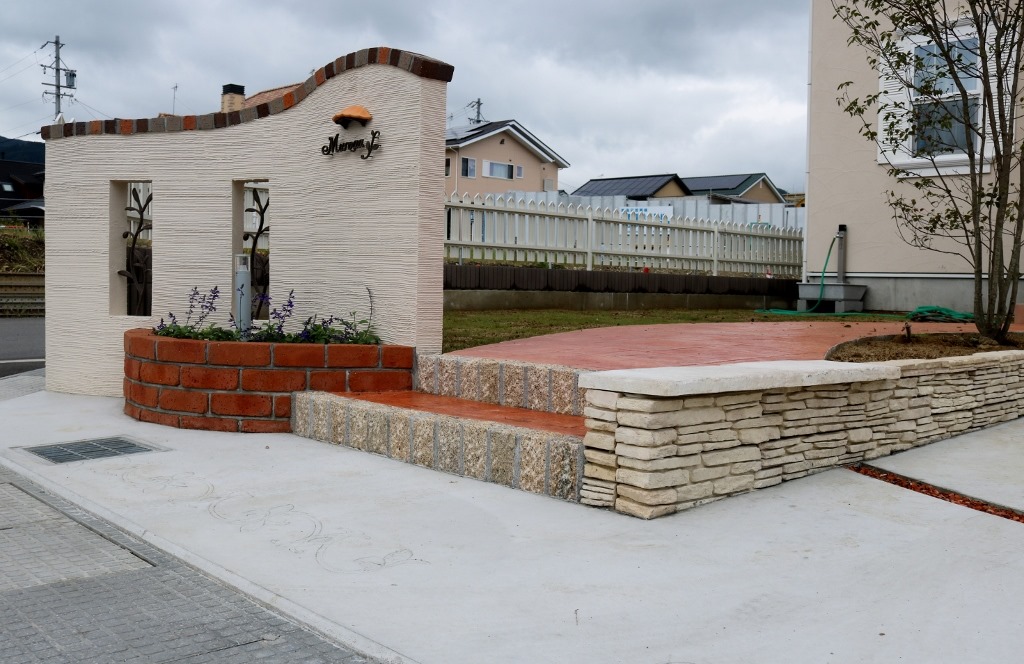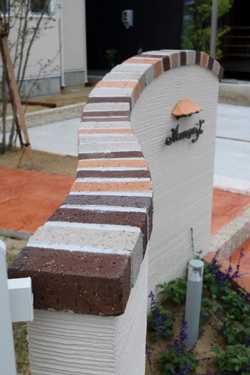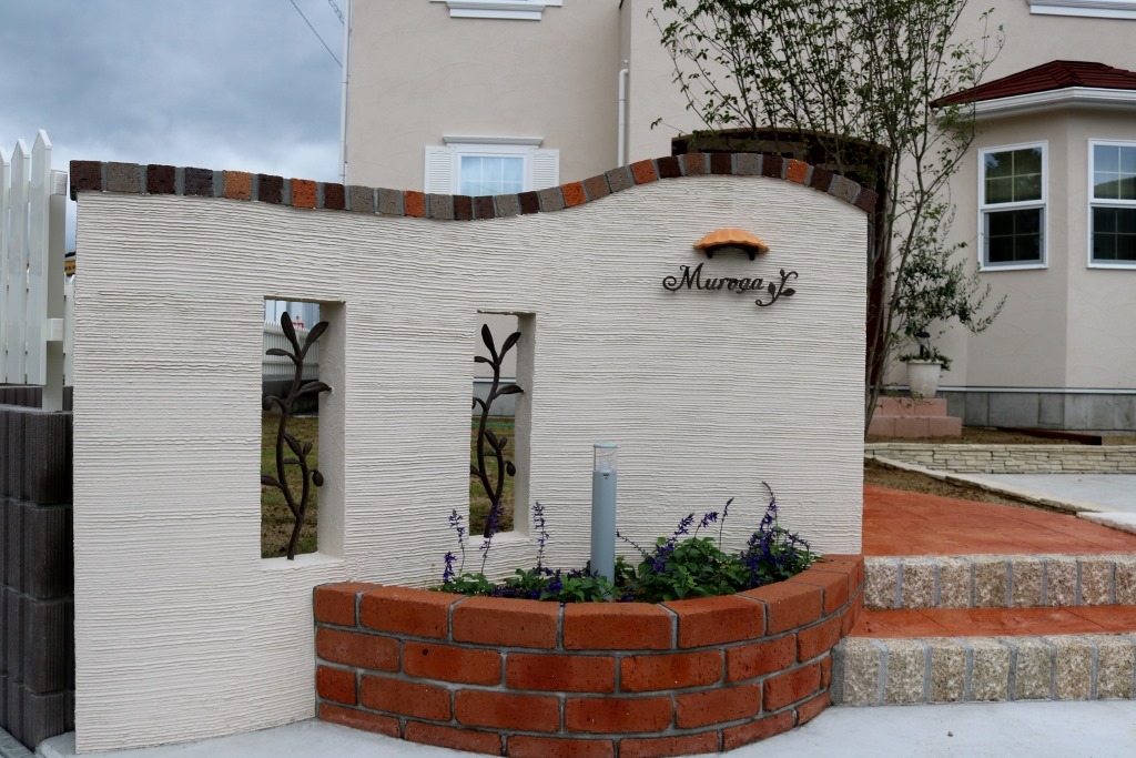 建物に合わせて可愛らしくデザインしたエクステリアの施工現場です。曲線に作った塗り壁の門柱にディーズガーデンのサイン・表札灯・アールフィックスフェンスを取り付け、天端にはレンガコバ笠木をのせました。駐車場の縁をブラッドストーンのマドックZで施工して通路部分はスタンプコンクリートです。