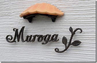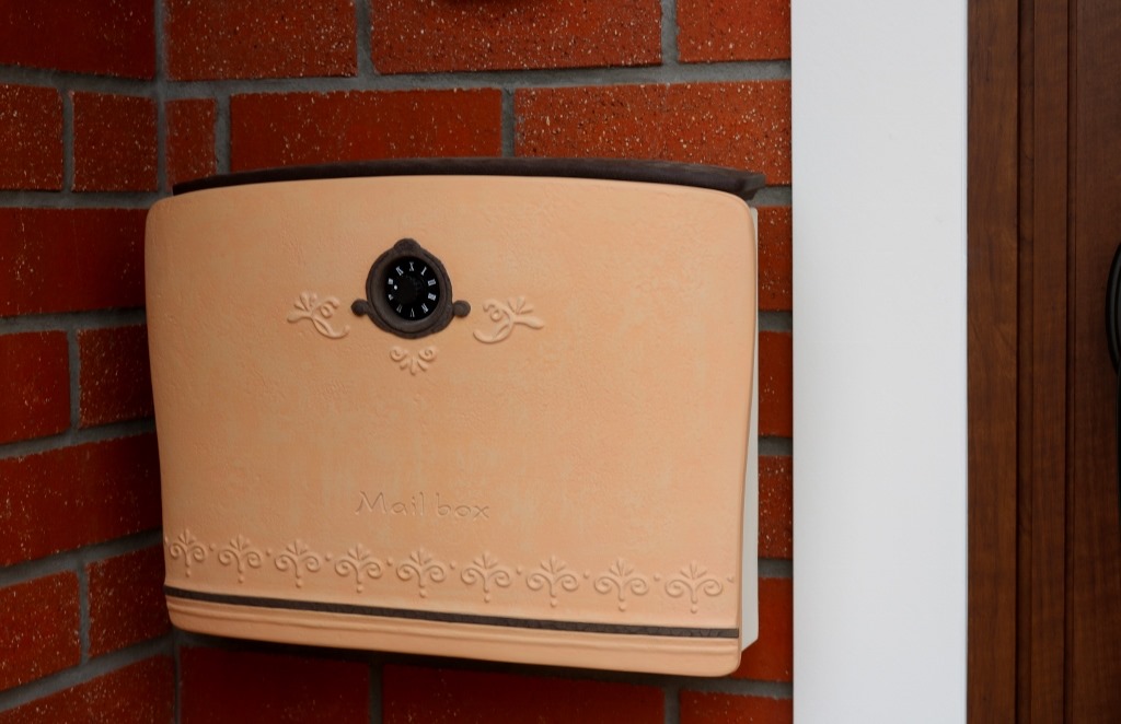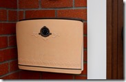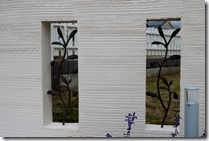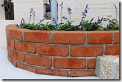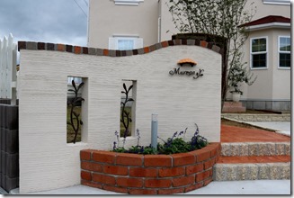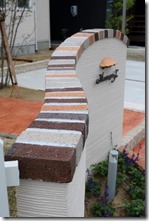門柱を前から見ると天端が曲線に、上から見ると壁が曲線になっているのが良くわかります。塗り壁にはデイーズサインとミニオーナメント取り付け、その上に表札灯です。スリットにはデイーズガーデンのRフィックスフェンスを取りつけ、少しアイボリーを帯びたジョリパツトの塗り壁にオレンジ色の煉瓦花壇がよく合います。