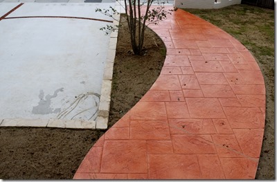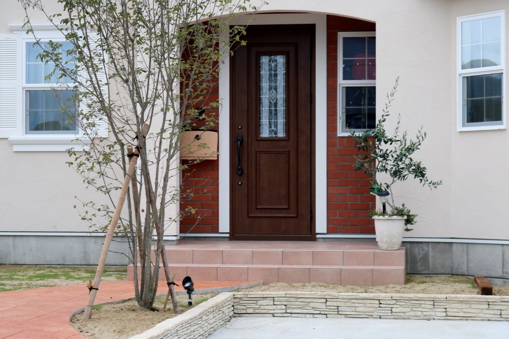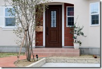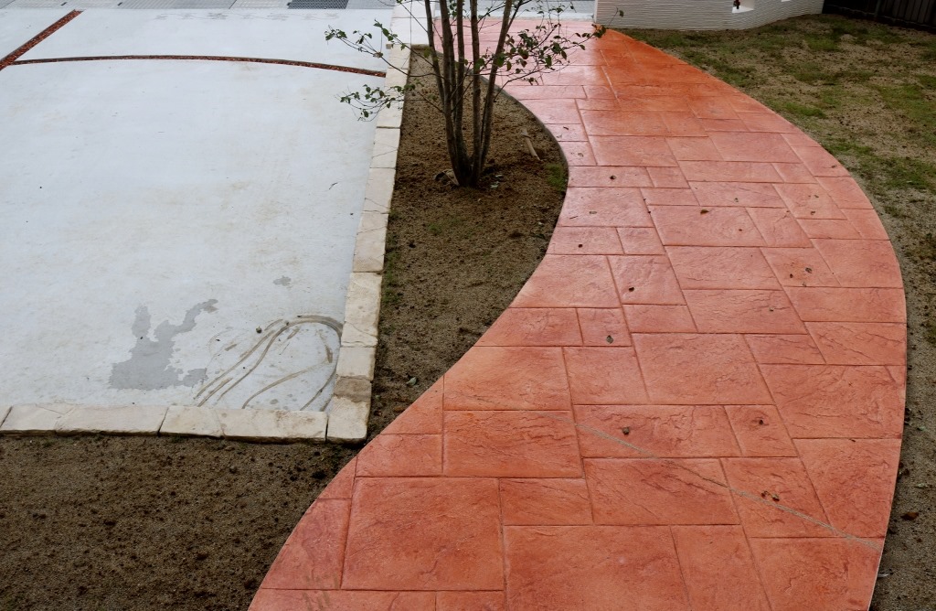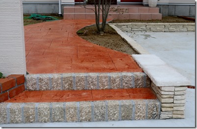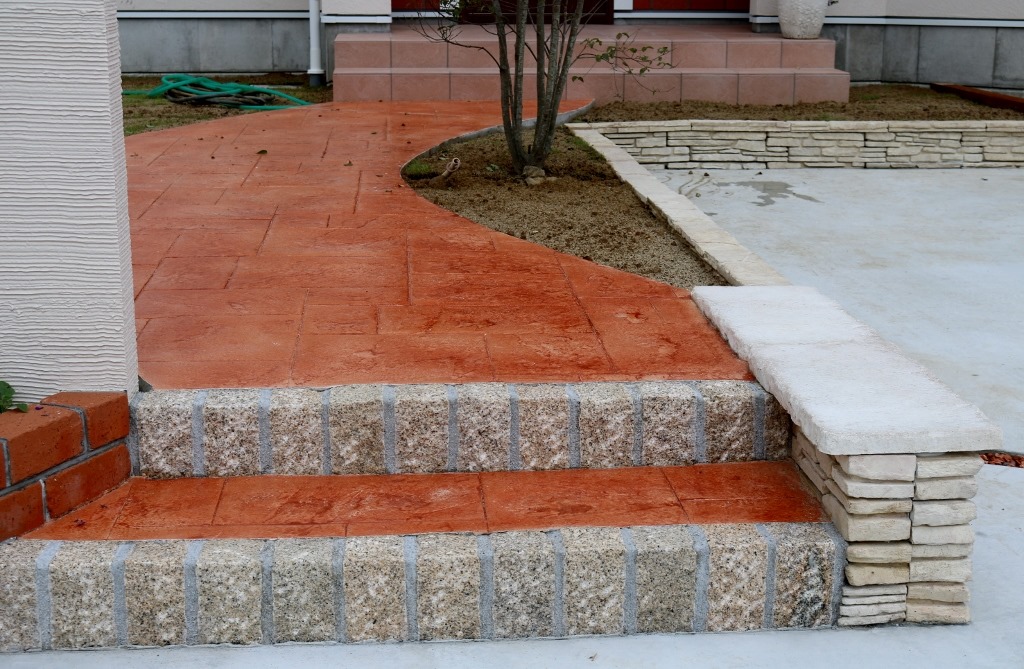玄関までの通路は道路側に御影石で階段を作り、床をスタンプコンクリートで施工しています。模様はアシュラです。