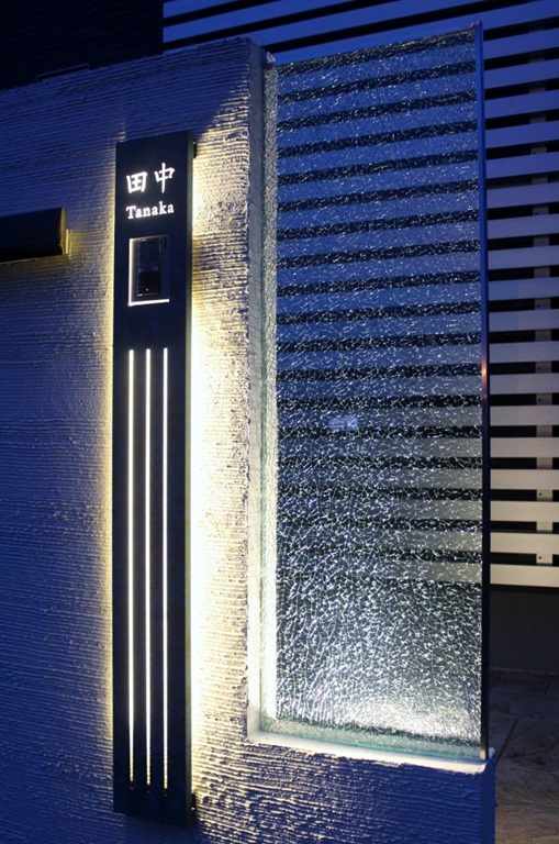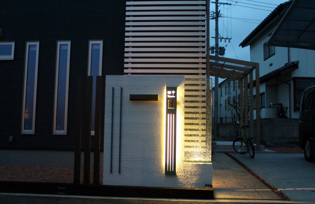 インターホンカバー尹尚の印象深い照明。 2016-11-282019-02-27 by View all posts by toledo ジュエルグラスとインターホンカバーの尹尚を取り付けた門柱は、アップライトの明かりがジュエルグラスを透過して、夜間も素敵なエクステリアの票所を見せてくれています。 縦に細長いインターホンカバーの尹尚に和文字と欧文字、インターホン子機の下に縦ラインをデザインして、そこから灯りが漏れています。 *ライティングされた外構は須坂市の施工現場です。 トレドは「プロの庭照明の店」です。