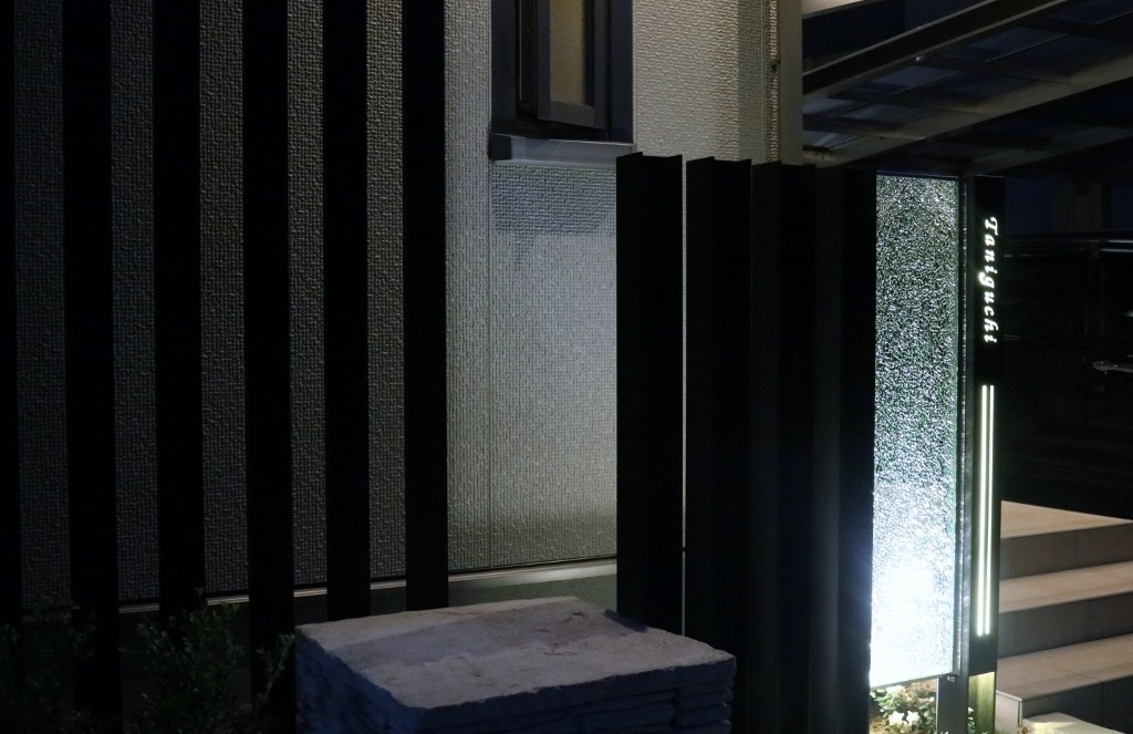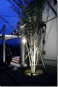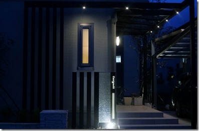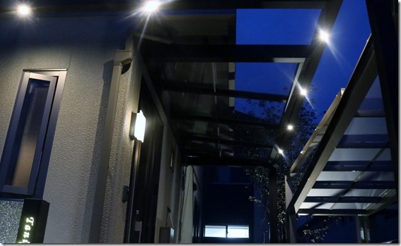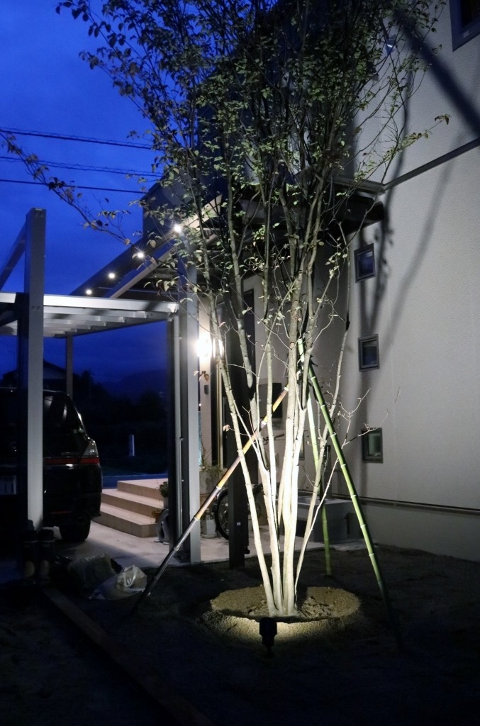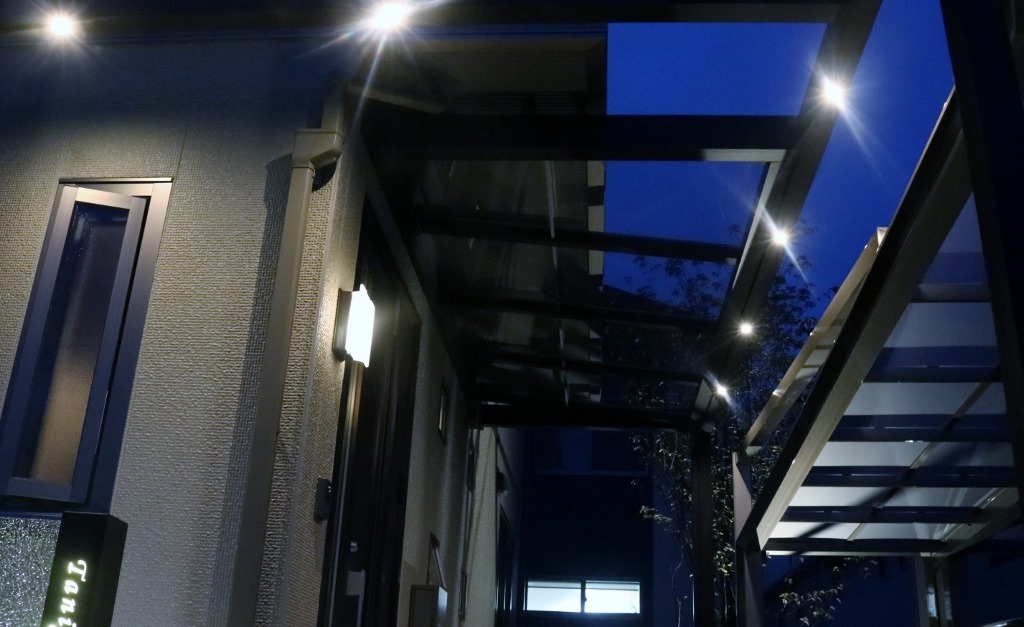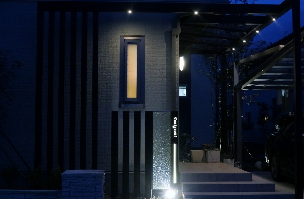 玄関ポーチにLIXILのプラスGルーフを取り付け門柱上のプラスGとにLED照明を取り付け照らしています。庭に植えた大きなシンボルツリーも株元からガーデンアップライトで照らしました。