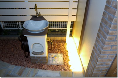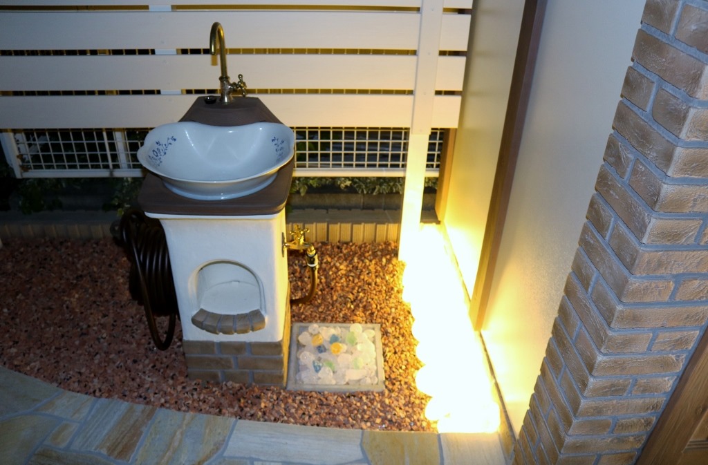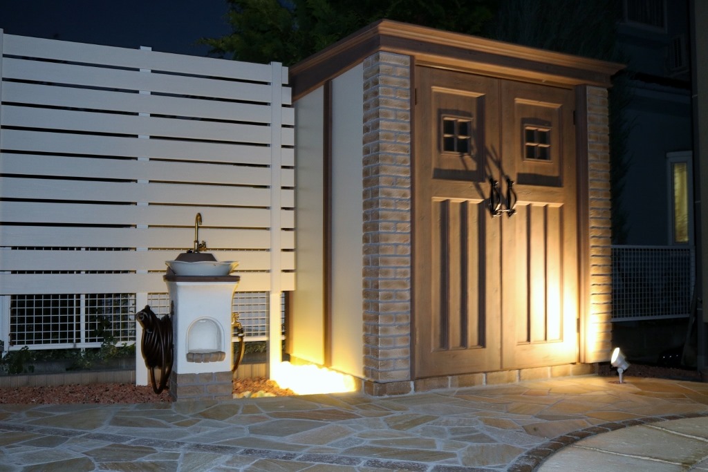 カンナ物置の横に建物近くにあった水道を移動させ、夜もしよいできるように物置の横にLED照明にリコスーンで楽しめる照明にしました。