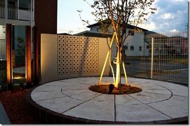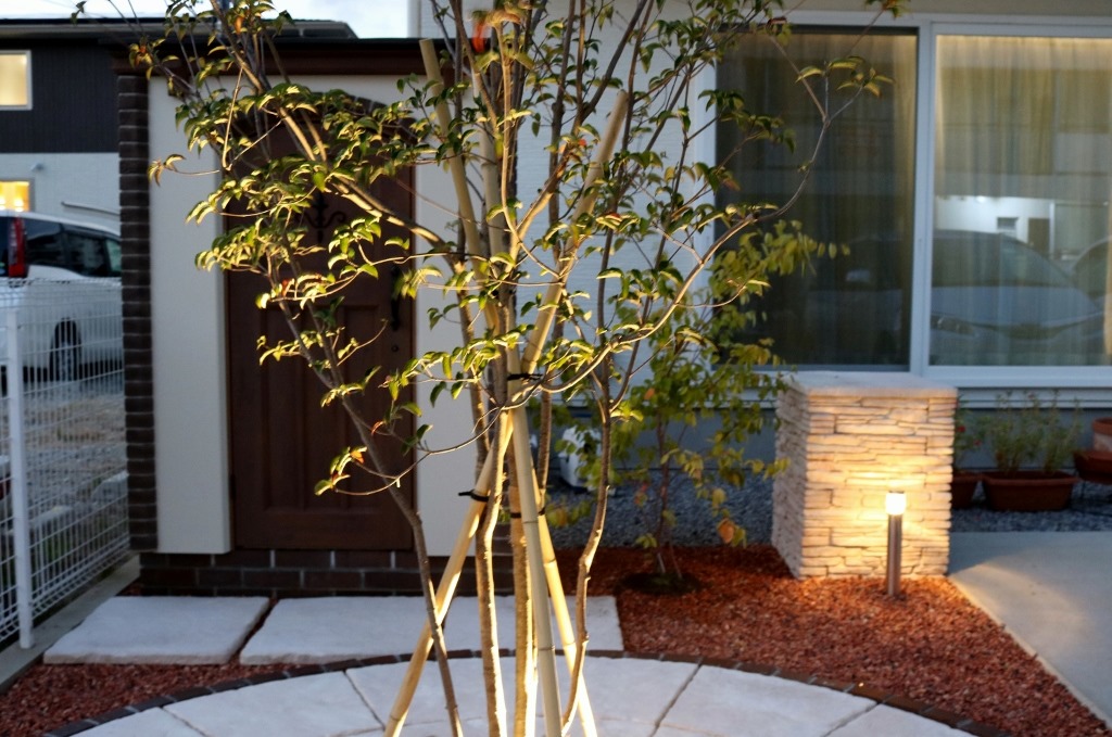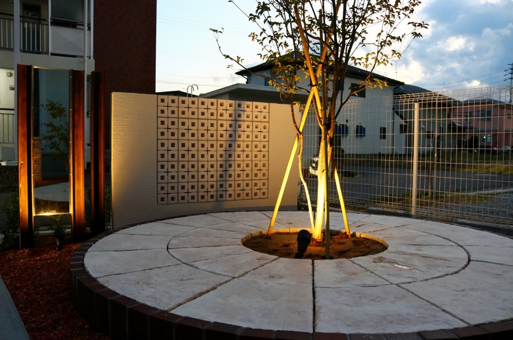庭の中心にブラッドストーンでサークルを作りシンボルツリーを植えてガーデンアップライトで寺師、カンナキュート物置の横にブラッドストーンマドックZの角柱を施工して手前にガーデンポールライトを設置、照明は壁などに当て間接的に見せたほうがきれいに見えます。
