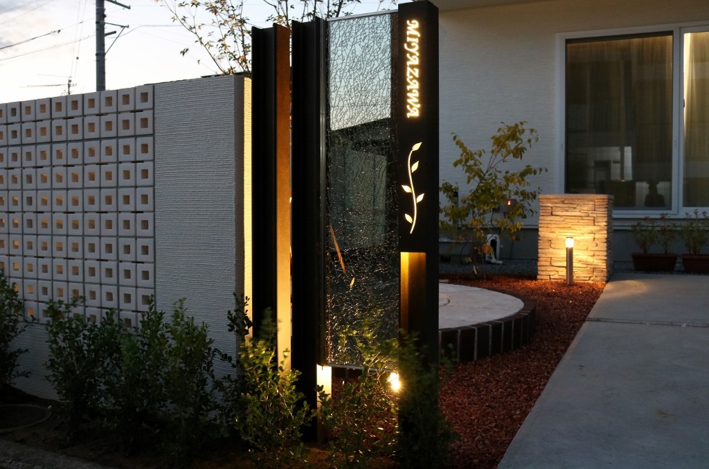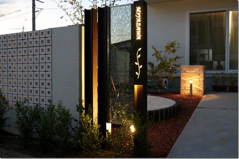 エクステリア工事でプレミアムH鋼門柱と庭の工事をした現場のライティングはプレミアム門柱の灯りが際立っています。ジュエルグラスもミラーを使用しているので綺麗です。