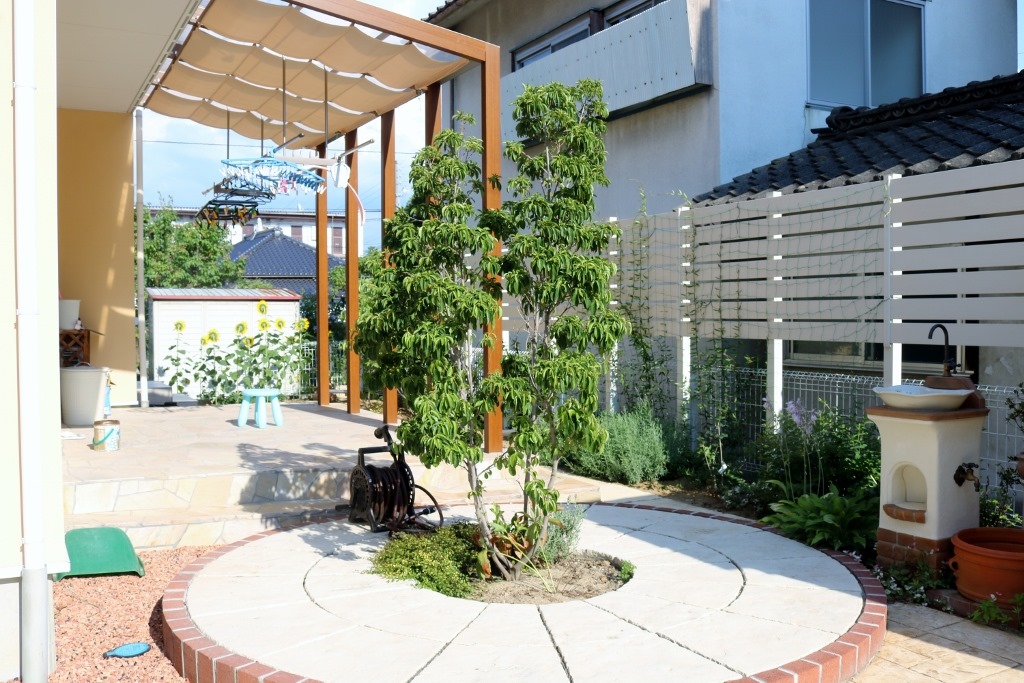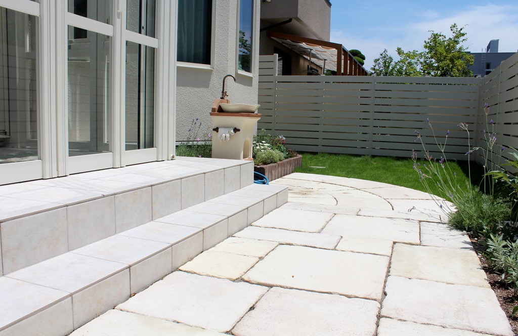 エクステリア施工で庭をアルファウッド・アイボリーで外からは見えづらくしましたリビング前に作られたテラスが使いやすいです。 長野市内