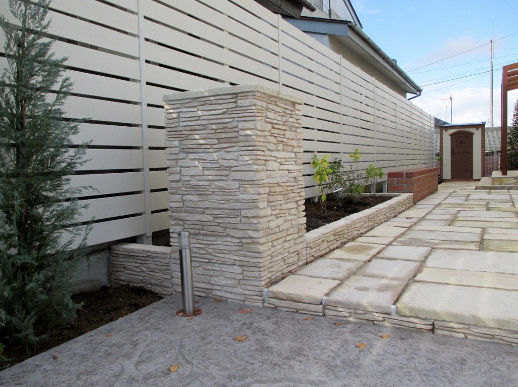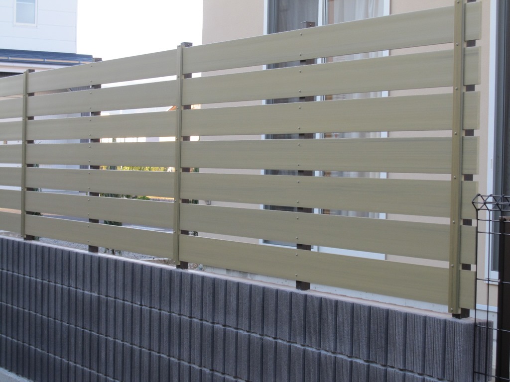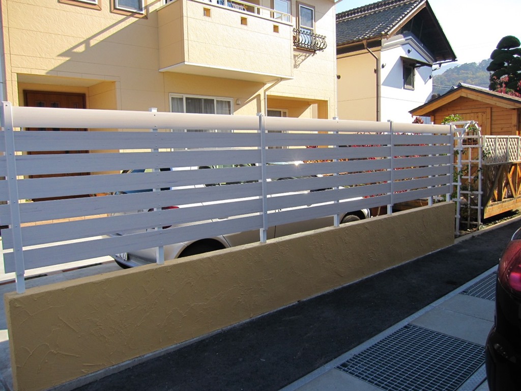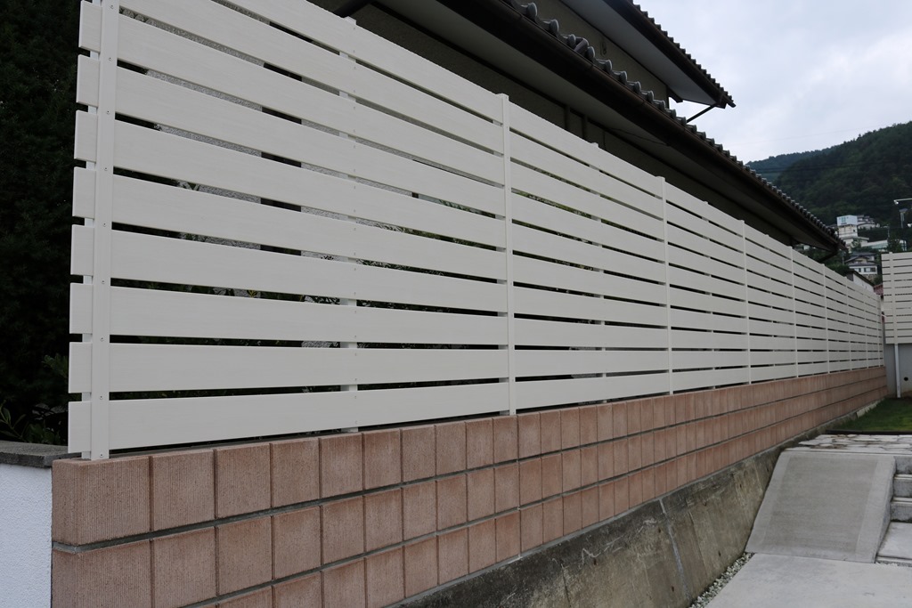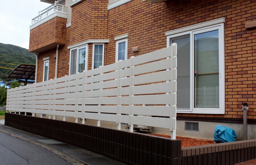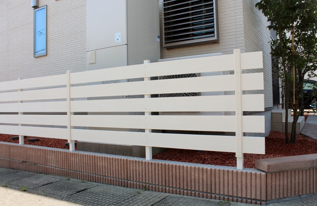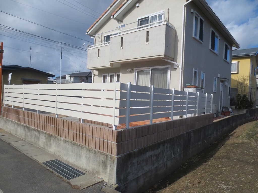 レンガ調の外壁に似合うアイボリー色の樹脂板でブロツクの上にフェンスを施工した現場です。 長野市