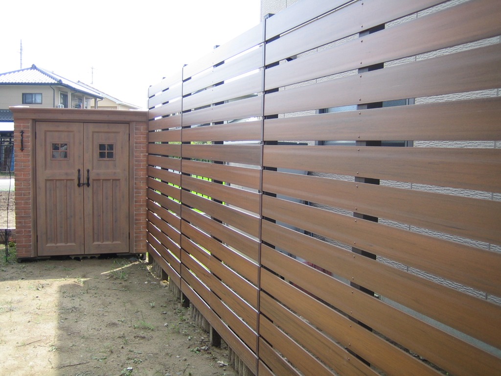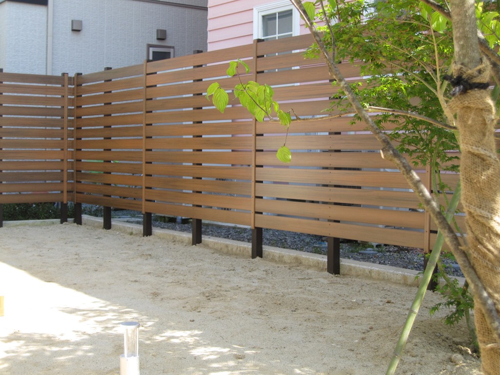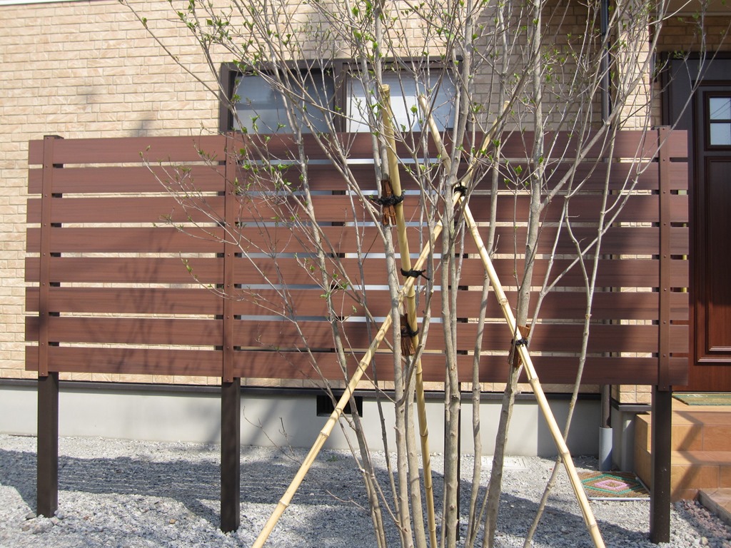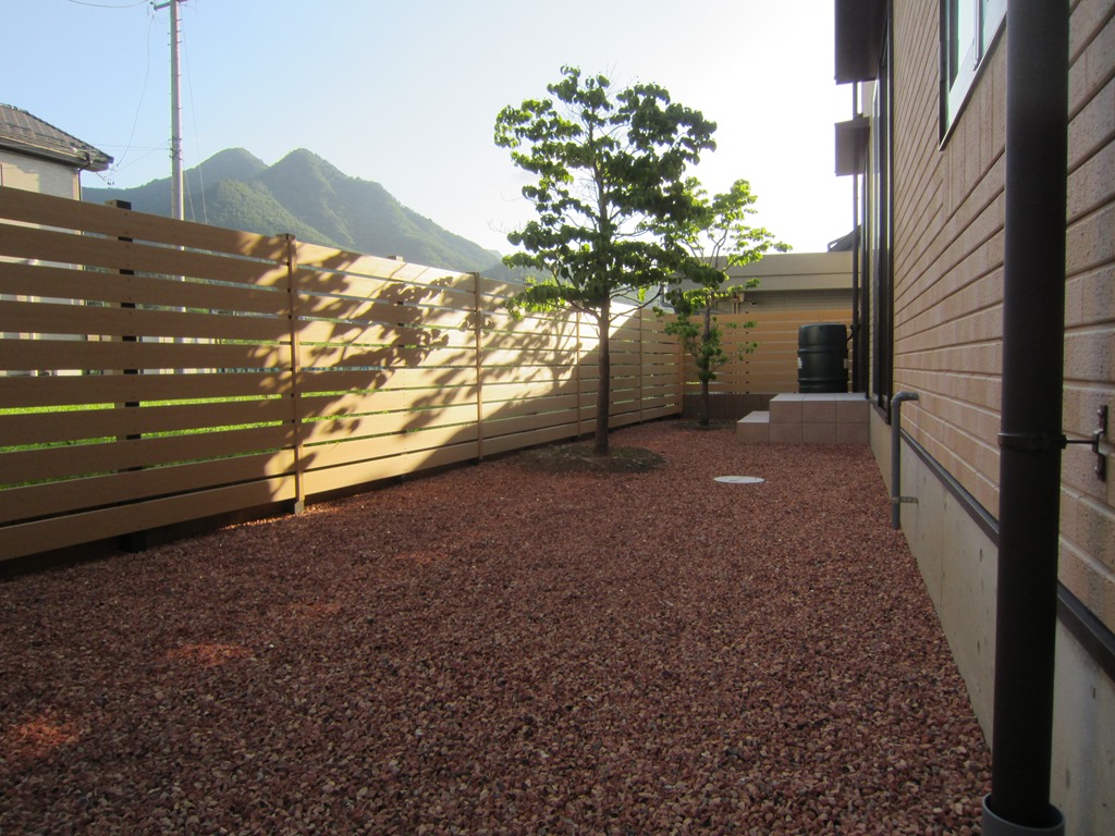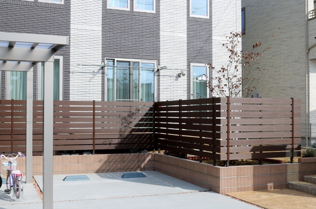 マイティウッドのダークブラウンで隣地の南側の境界に樹脂板で目隠しをした外構です。 小布施町