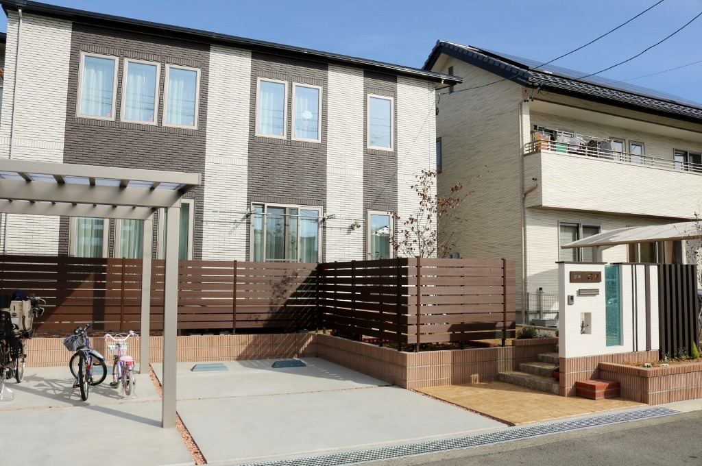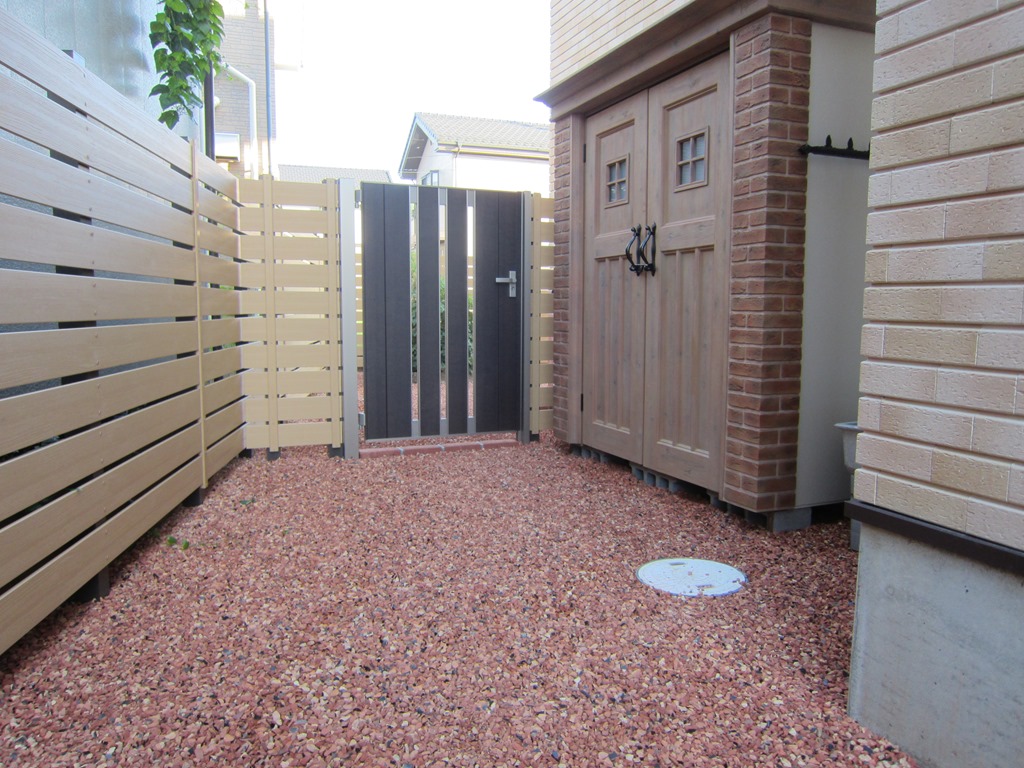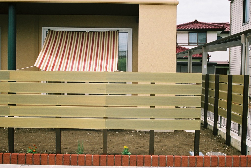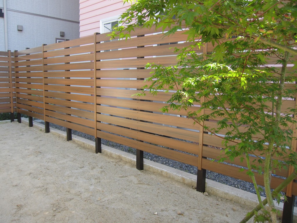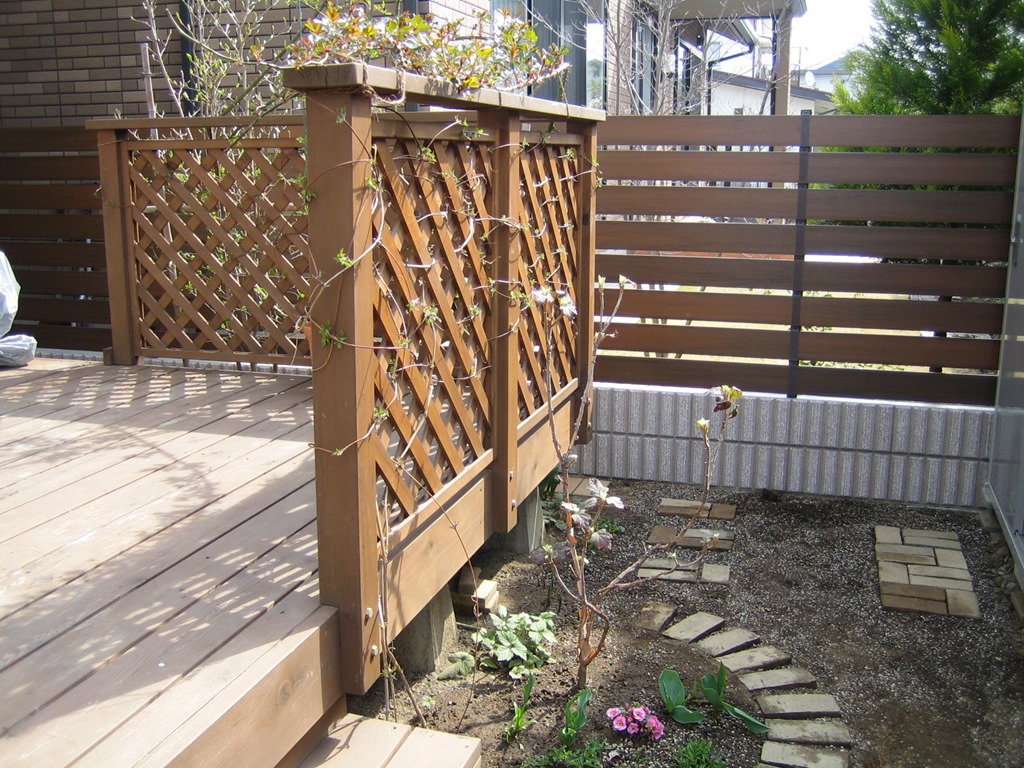 マイティウッドのダークブラウンで隣地の南側の境界に樹脂板で目隠しをした外構です。 小布施町