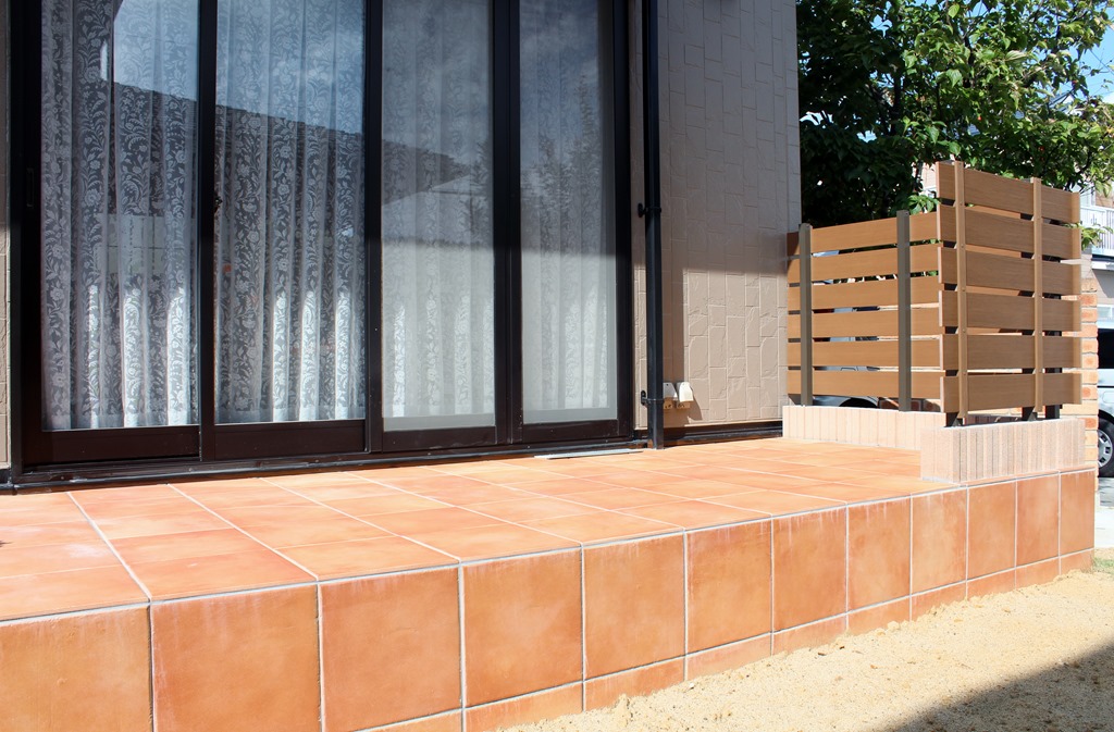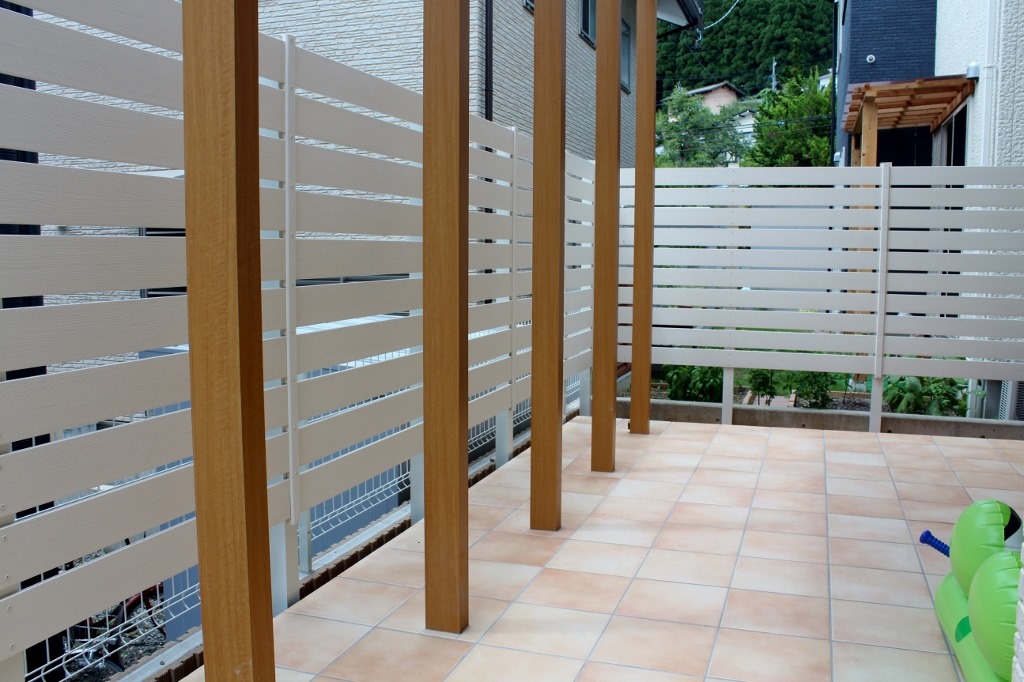 タイル貼りで仕上げたリビング前のテラスの側面(道路側)に目隠しになるように樹脂板でフェンスを取り付けました。 長野市