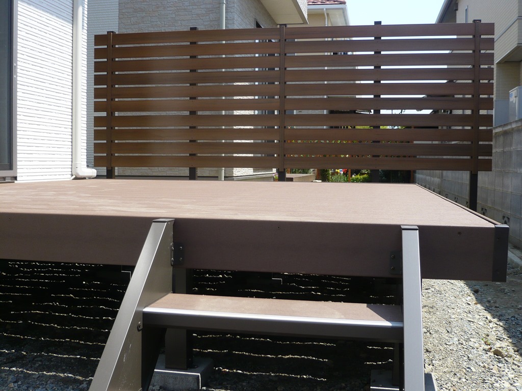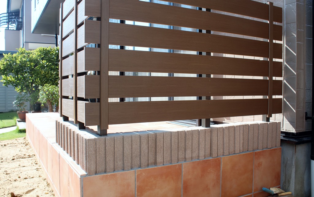 隣地境界までいっぱいに作ったタイル張テラスの目隠しに・西側の隣地境界にアルファウッドで目隠し施工をした現場です。 長野市