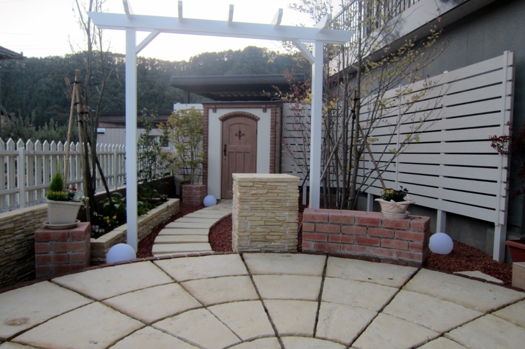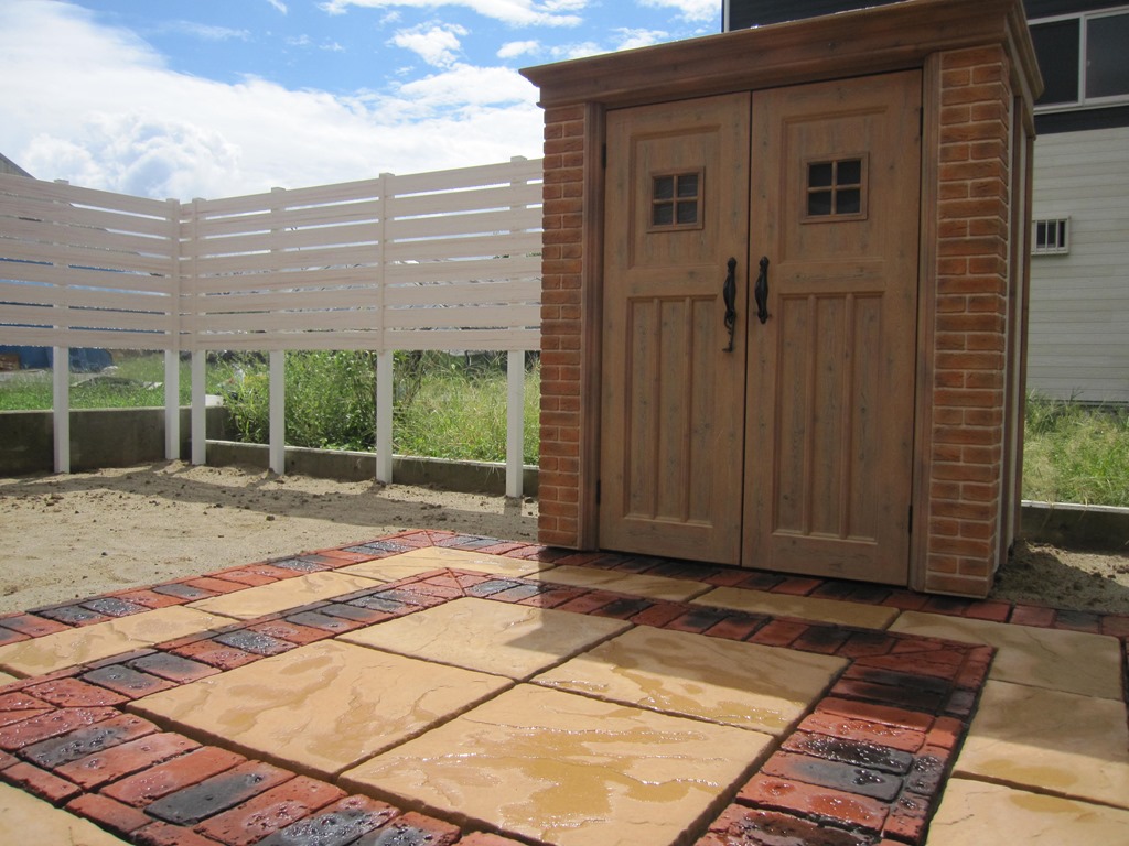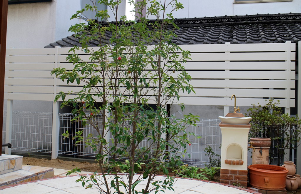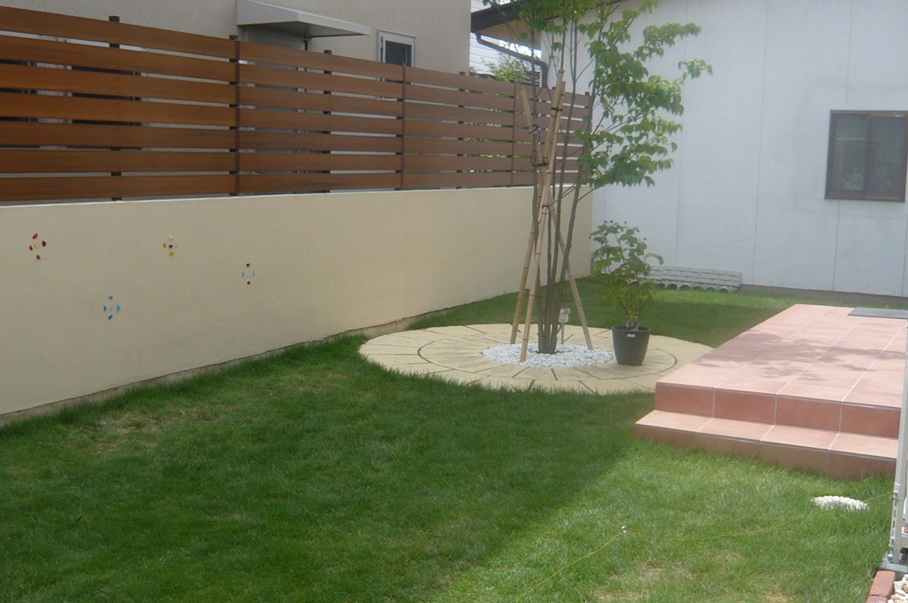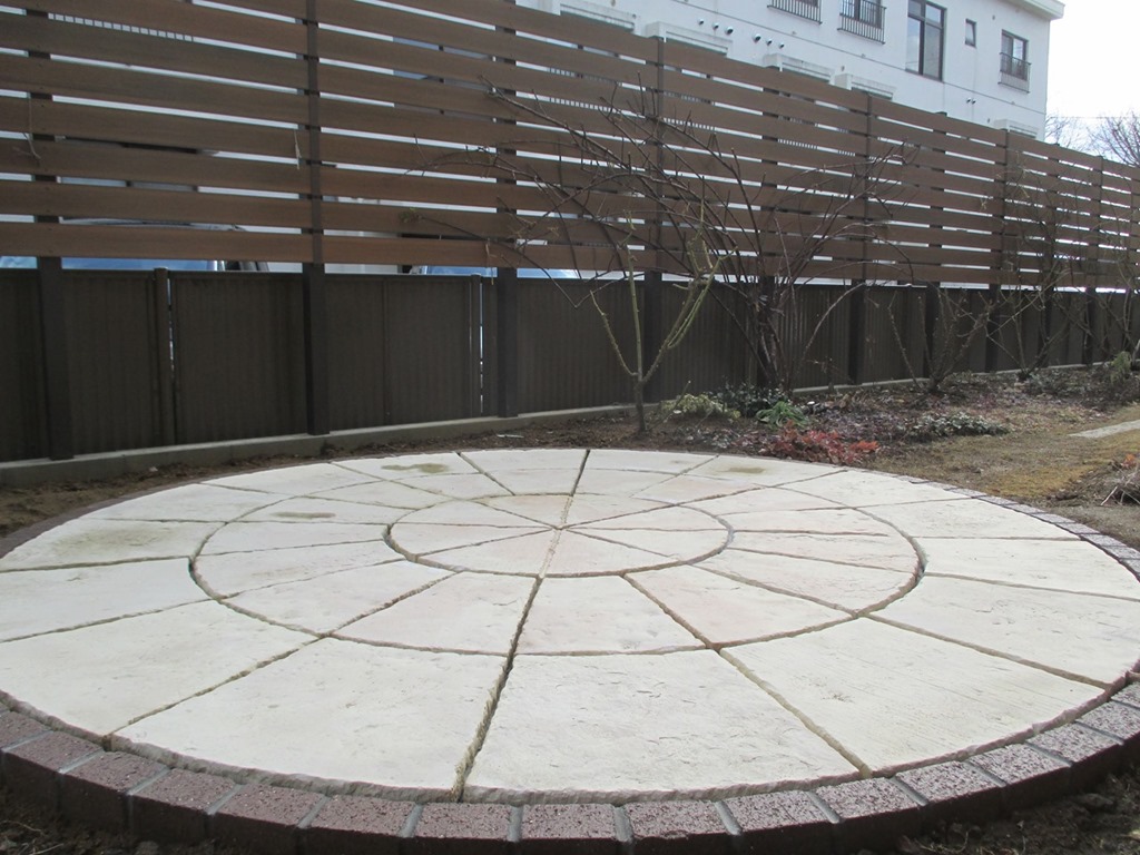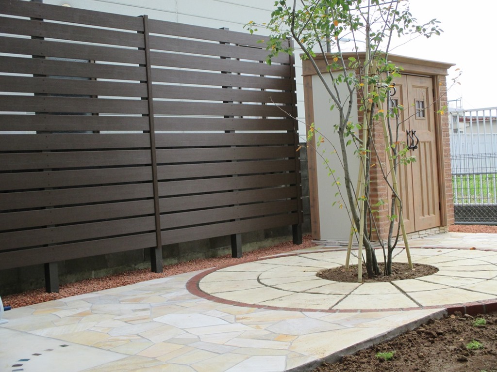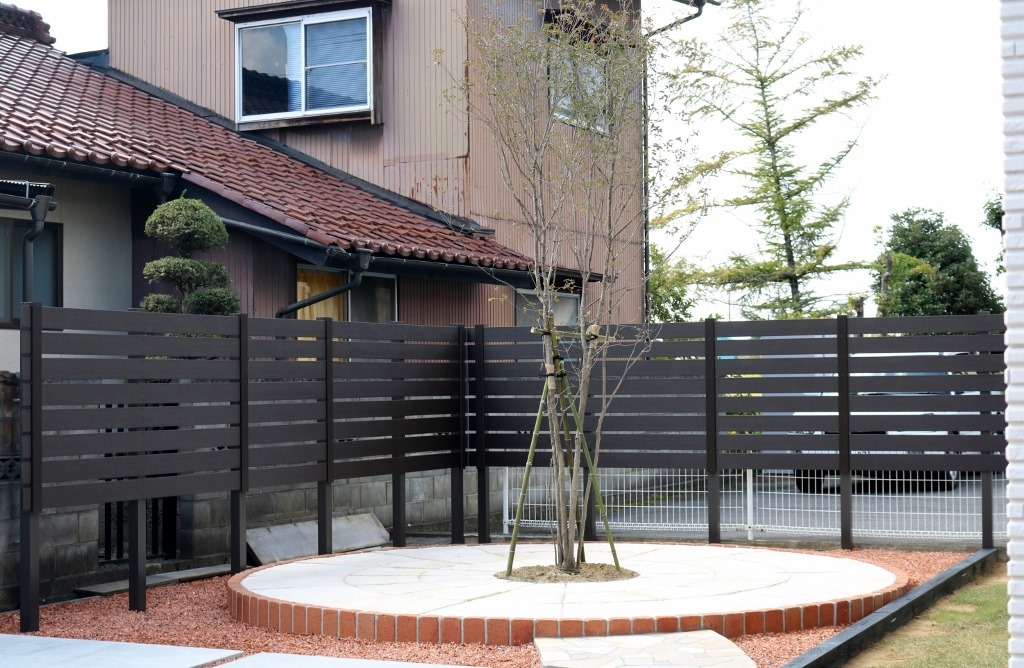 和の庭を洋風にリフォームをして隣地の畑からの視線を隠すためにアルミ柱を立ててアルファウッドを貼り付けた外構現場です。 長野市樹脂フェンス