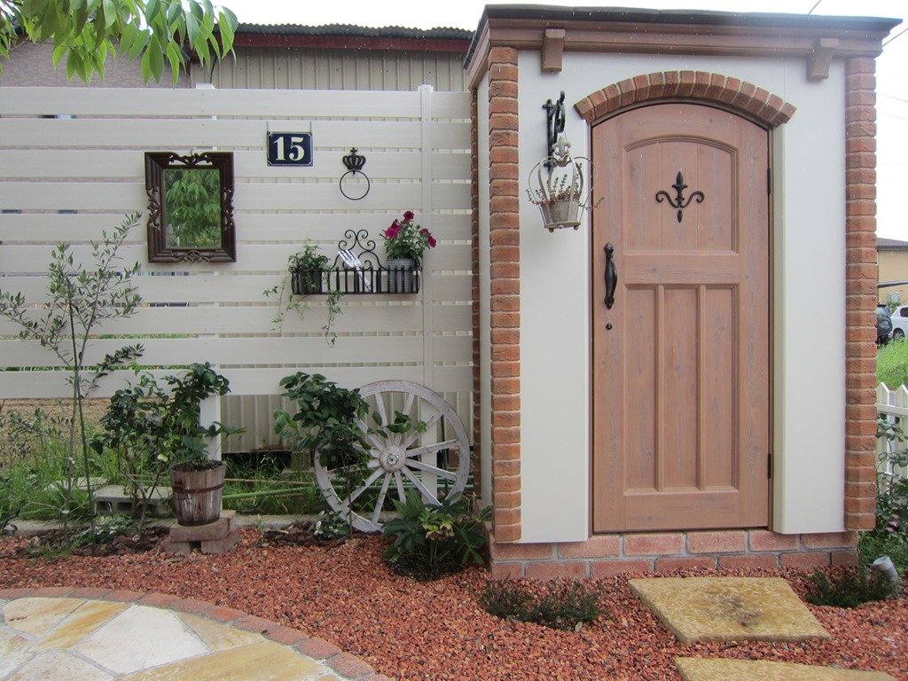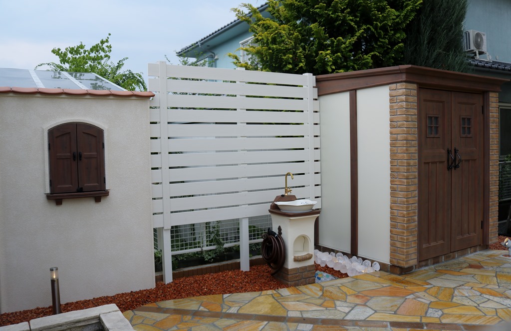 隣地境界側にカンナキュート物置とアルファウッドの樹脂板で目隠しを作りました、樹脂板塀はハンギングもできます。 長野市内