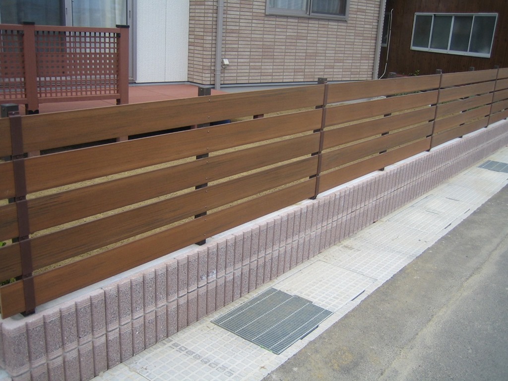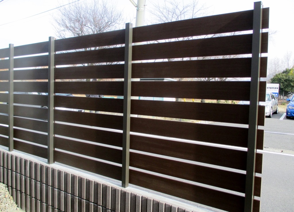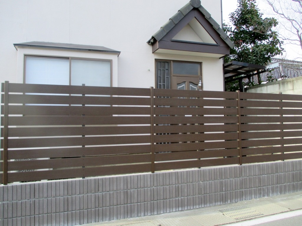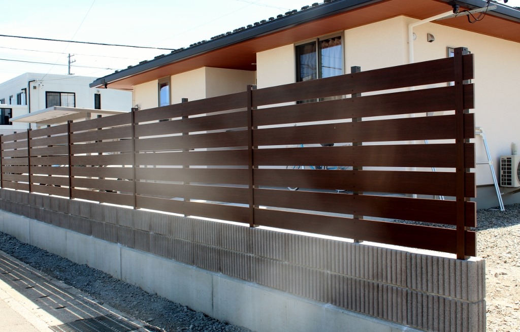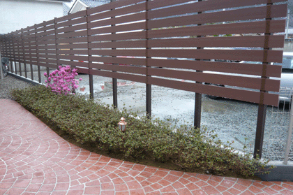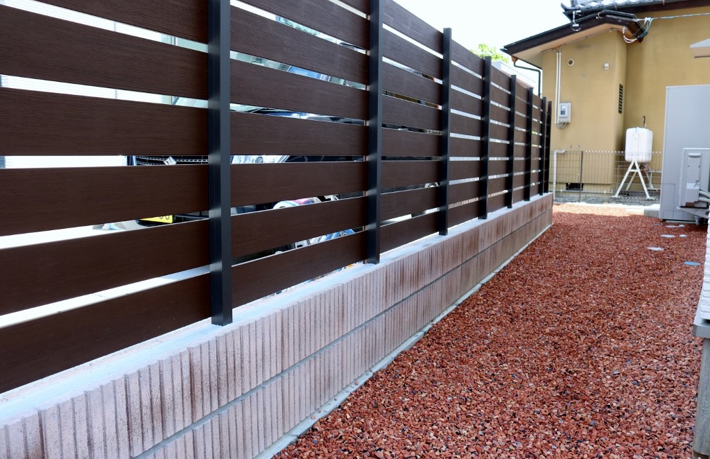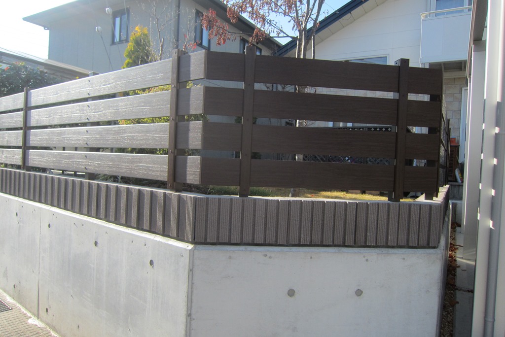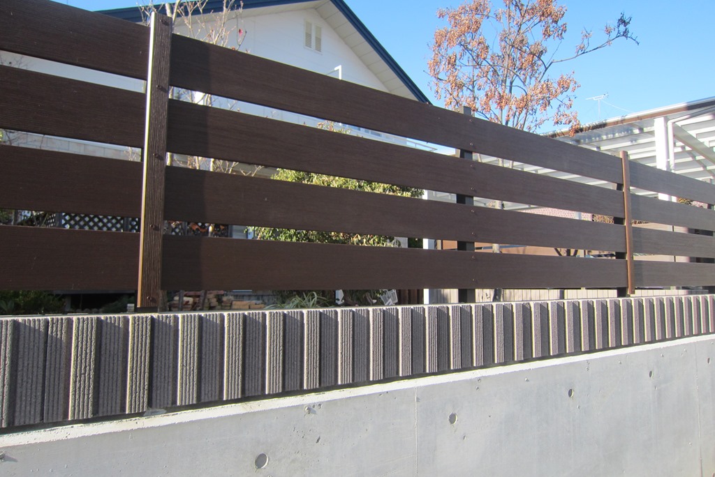 化粧ブロツクを隣地境界に積み、その上にアルファウッドディープブラウンで目隠しを兼ねたフェンスの施工をしました。 長野市