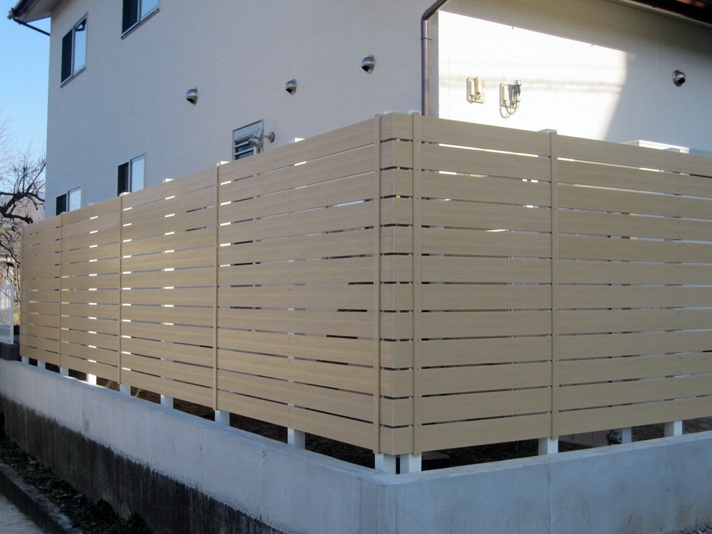 明るい色のライトオーカーの樹脂板アルファウッドで庭回りを囲い目隠しにした現場です。 上田市樹脂フェンス