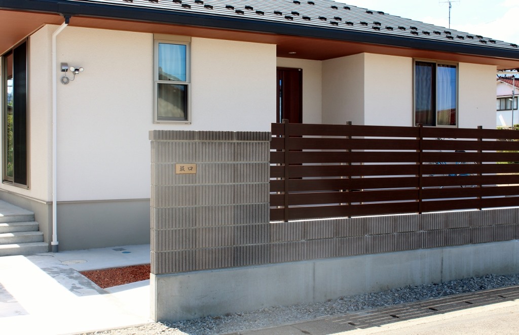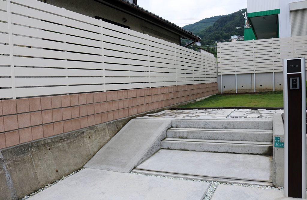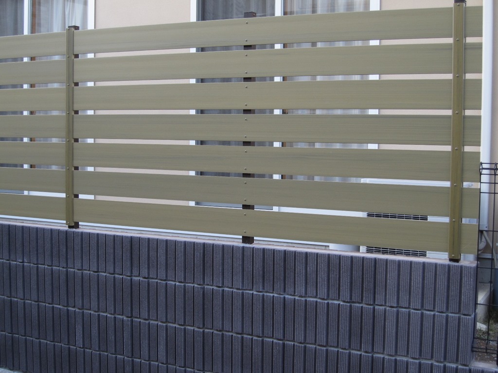 玄関から道路までの距離があまりなく、目隠しを兼ねたブロツク・フェンスをアルファウッドの樹脂板で施工しました。 千曲市