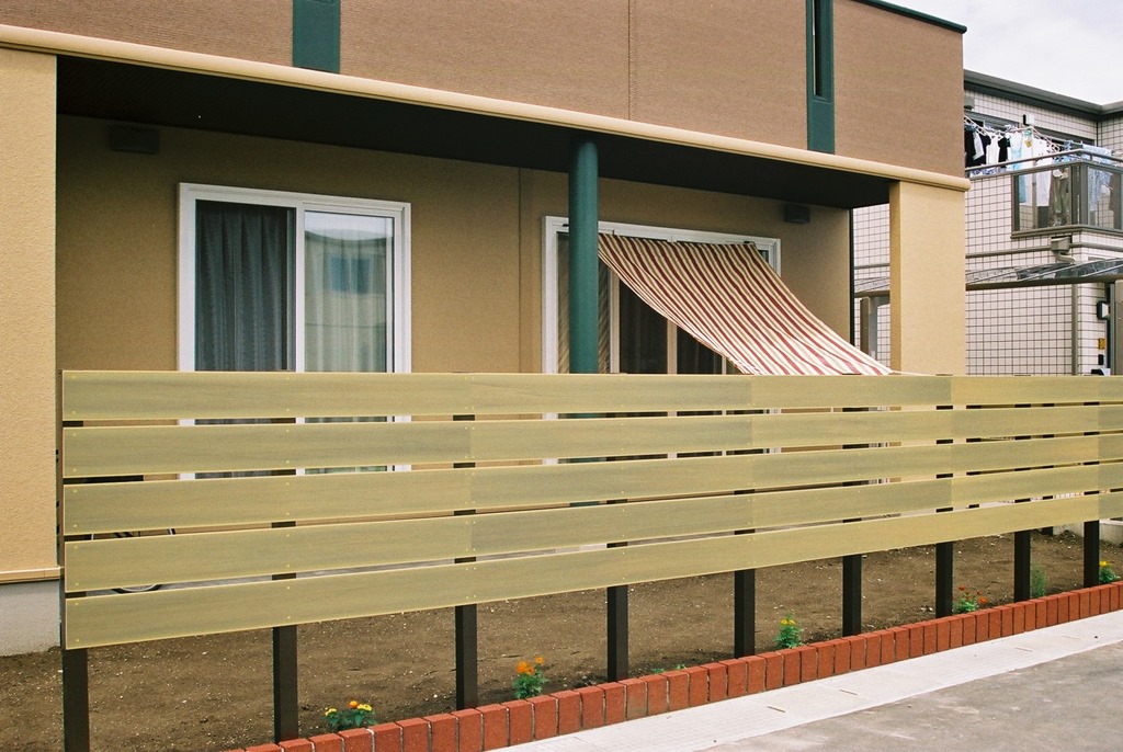 アルアウッドのライトオーカーは明るい感じのするカラーの樹脂板です。隙間を15ミリ開けて目隠しにしました。 千曲市