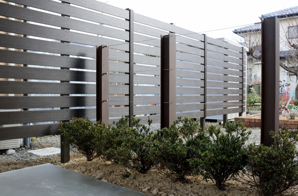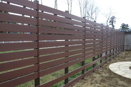 隣地境界側にアルミ柱70角を立て、アルファウッドのディーブブラウンを施工。 長野市内