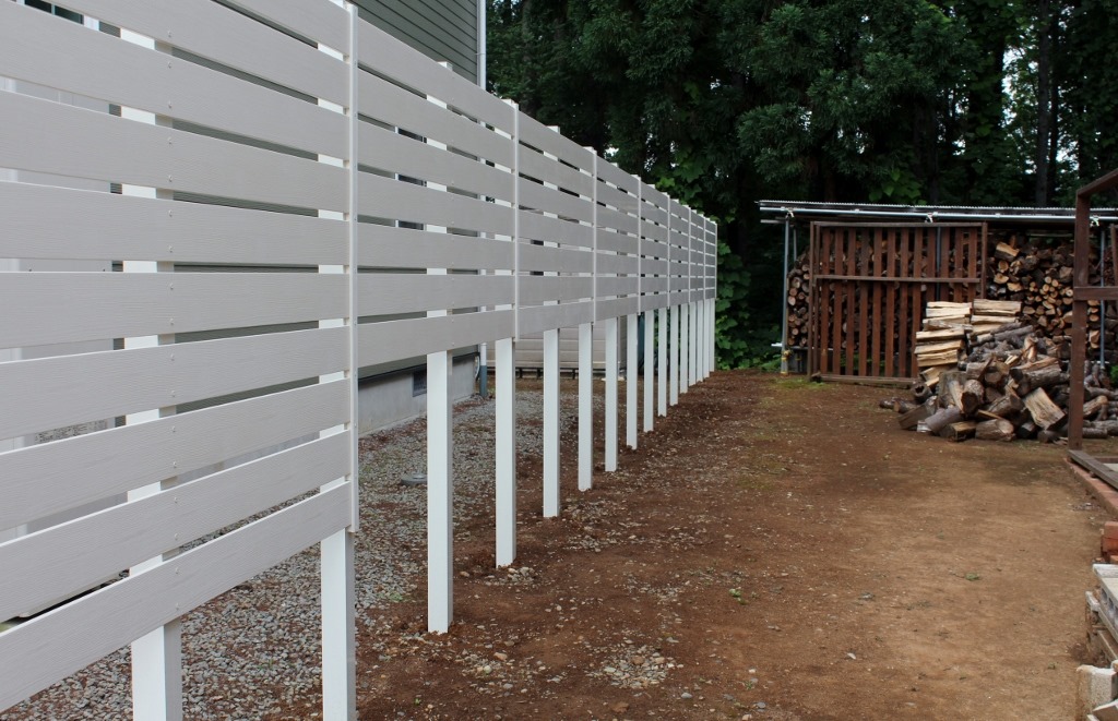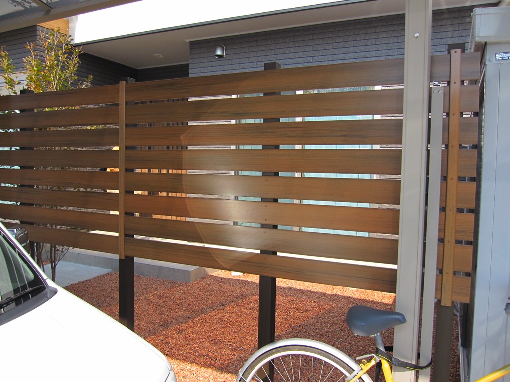 駐車場と庭の堺と隣地境界に樹脂板のマイティウッドで目隠し工事をした現場です。 須坂市