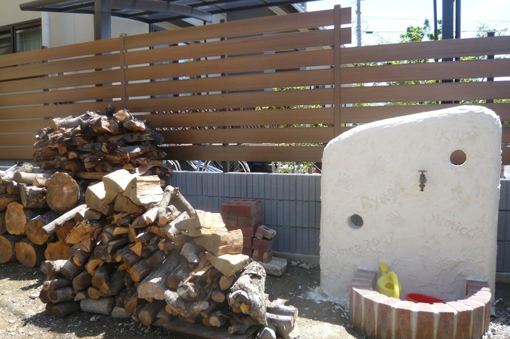 駐車場よりも敷地が高く土止めに積んだ化粧ブロックにアルファウッドの樹脂板を施工。 長野市内