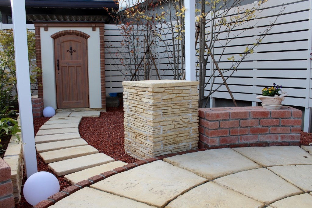 既存の基礎の上に化粧ブロックを2段積み、40角のアルミ柱を立てマイティウッド・チークブラウンを取り付けました。 長野市内