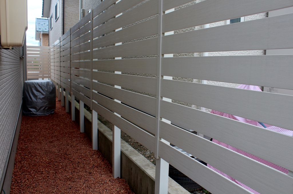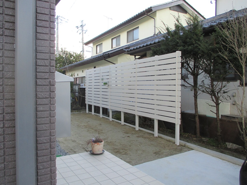 南側の隣地境界と西側の駐車場との堺に樹脂板で目隠し工事をしたエクステリアです。 長野市ジュシフェンス