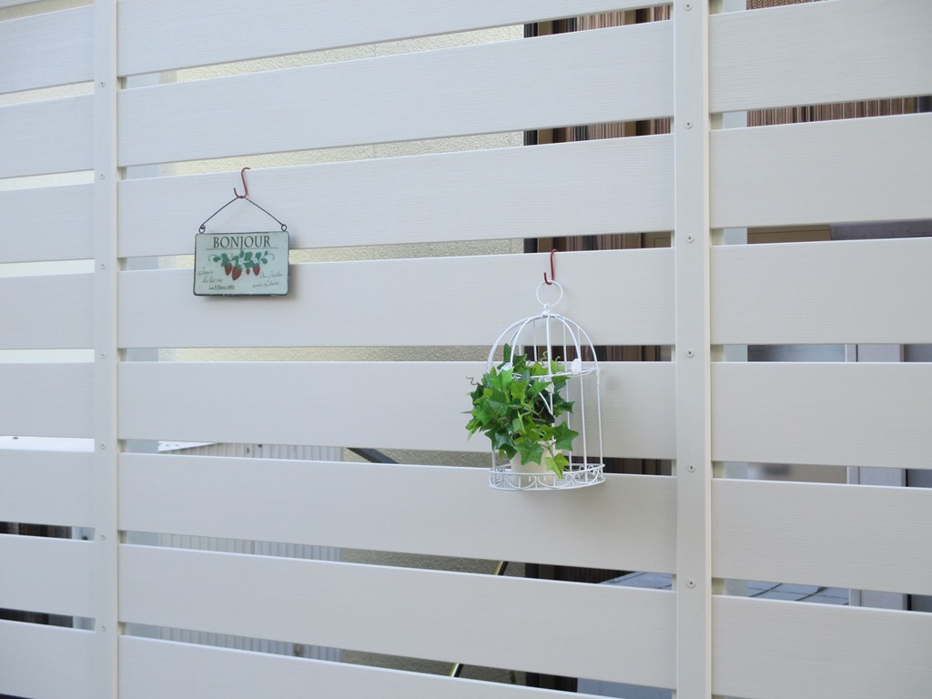アルフアウッドのアイボリーカラーで目隠し、樹脂板の隙間が2cmあるのでハンキングのできる板塀になります。 長野市内