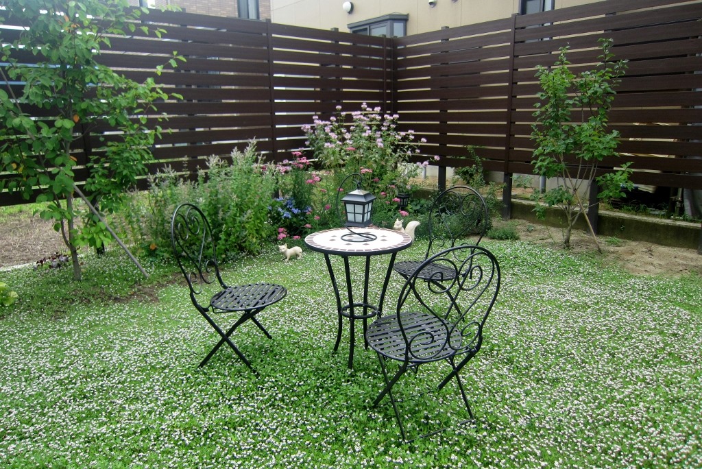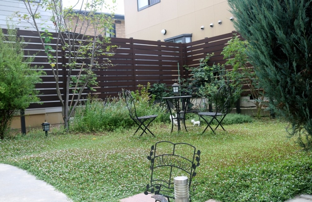 マイティウッドのチークブラウンで庭を囲った現場です。境界に塀がある事で感じの良い庭に見えます。 長野市樹脂フェンス