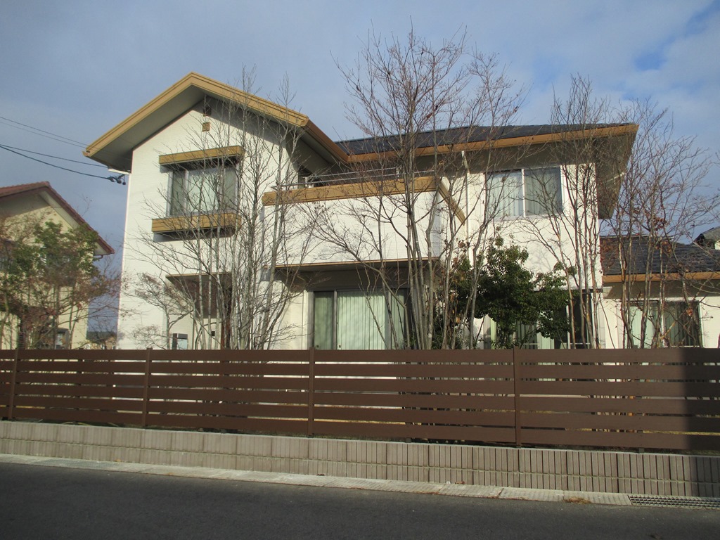 塗り壁の上にチークブラウンいろのマイティウッドを隣地境界に取り付けた現場です。 千曲市