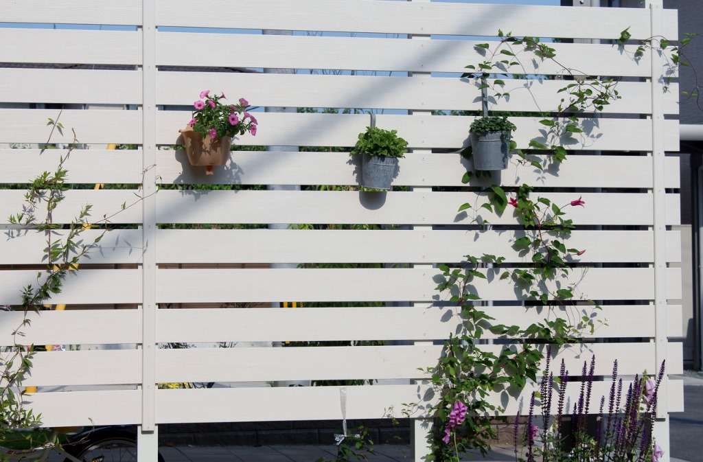 南側の隣地境界にアルファウッドで目隠しをしました。板塀の隙間を利用してハンキングも出来ます。 長野市