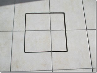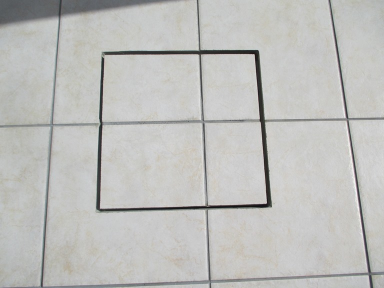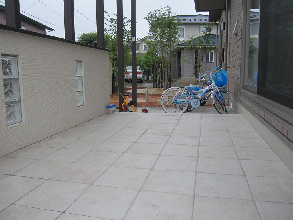 駐車場の奥に作られたテラススペースの前にある庭部分は、芝生を撤去して防草シートの上にテコラを敷きこんでいます。テラスの床にはイタリア製の300角タイルを貼ったのですが、床部分にタメマスがあったので、タイルを加工してタメマスの蓋にもタイルを貼って仕上げました。