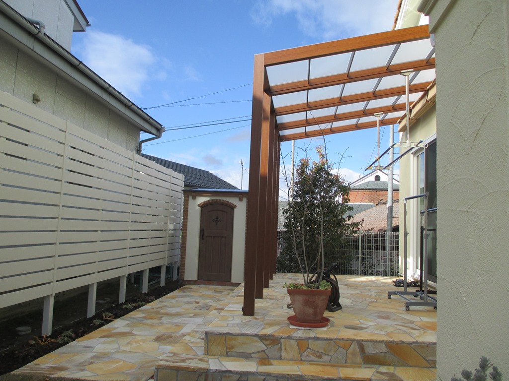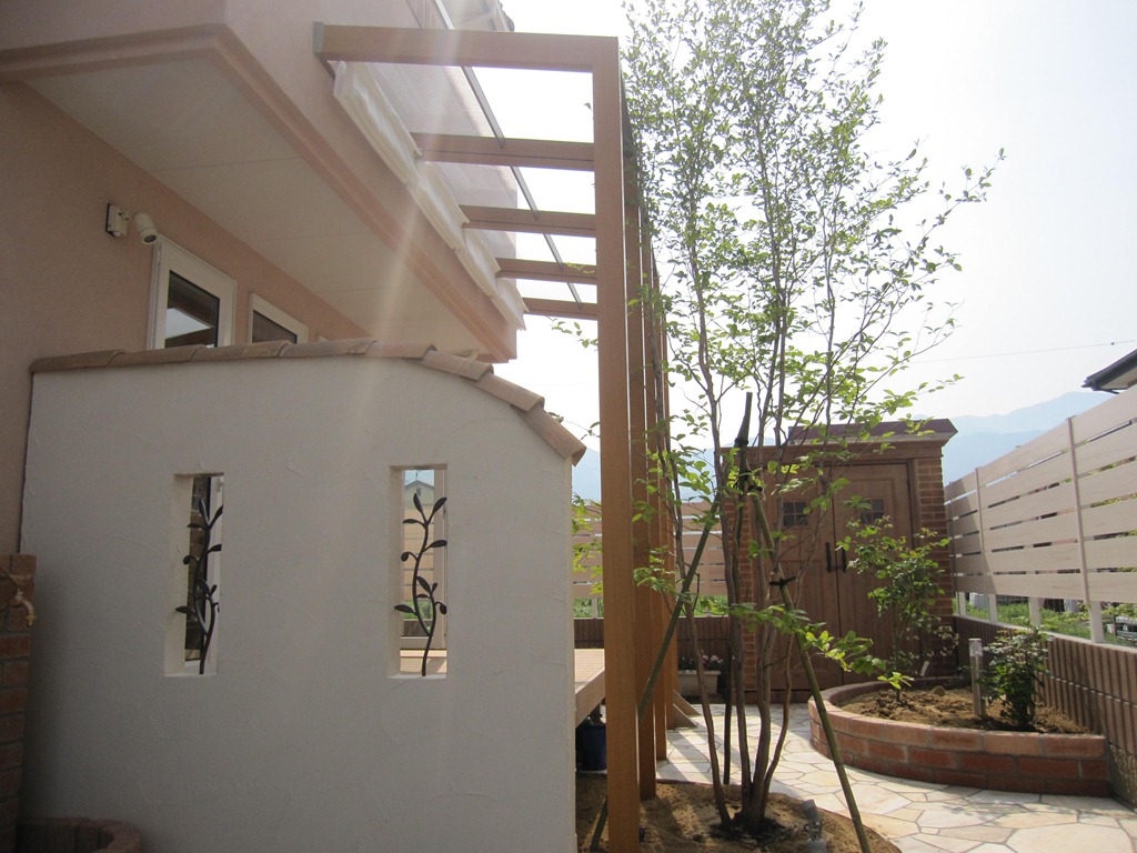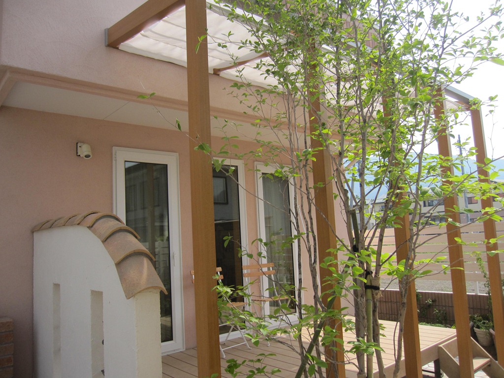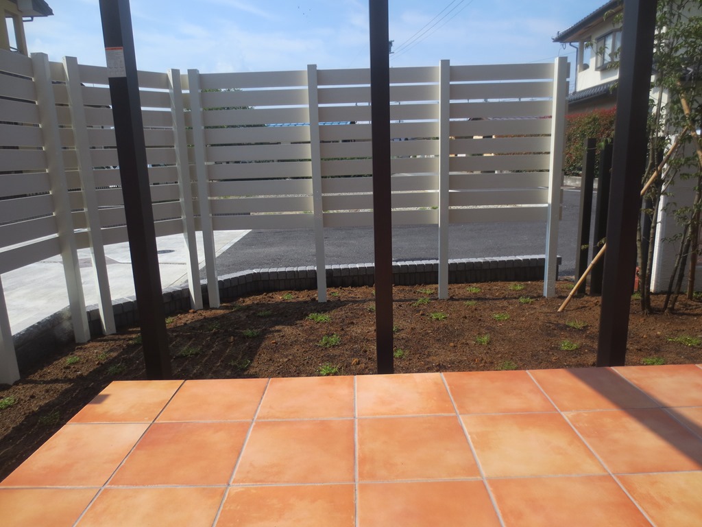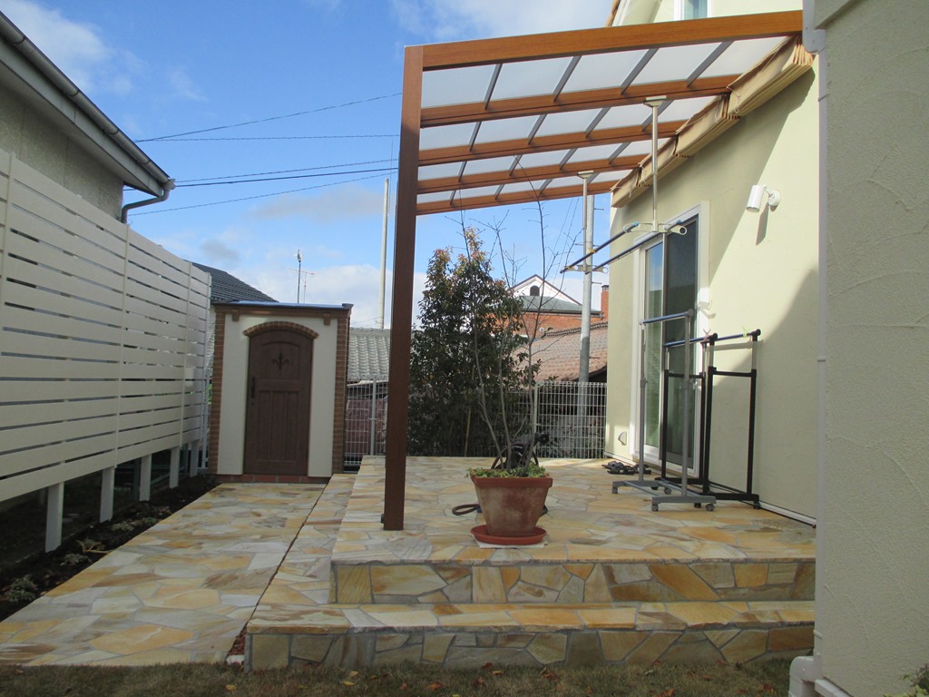 丸山様のお宅の庭が、とても明るく素敵に代わりました、庭の中に日除けの付いたテラスがあると、とても便利でそこで過ごす時間がとても有意義になります、外空間を上手く作ることで生活スタイルが全然変わってしまう事も良くあることです、長く付き合う庭だからこそ、長く居られる空間にしたいです。