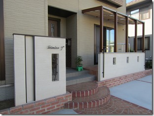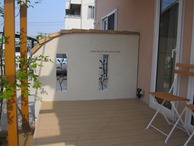 新野様のお宅のテラスは、リビングの前にココマの腰壁タイプです、天然石を貼った床で過ごす時にも、正面の腰壁のおかげで足元は見えません、やはりテラスの床はタイルか天然石の手入れの楽なものの方がいいです、腰壁の部分には、オリジナルのガラスブロックサインを埋め込んでいます。